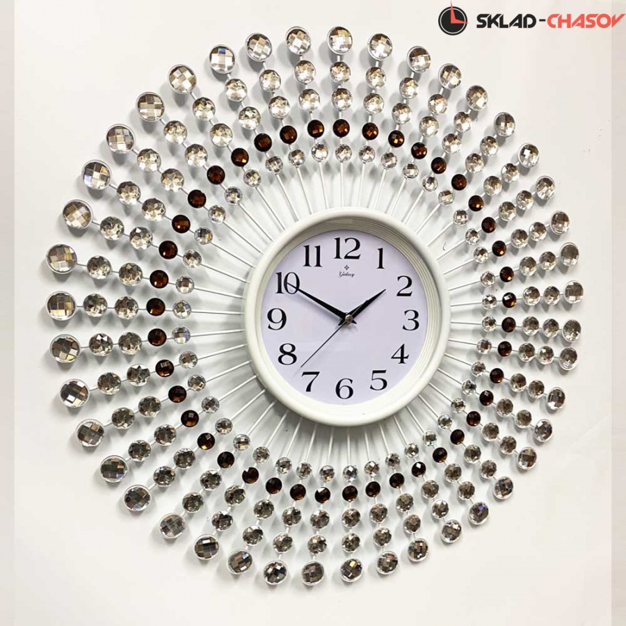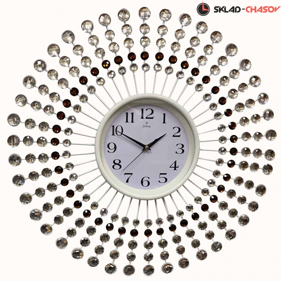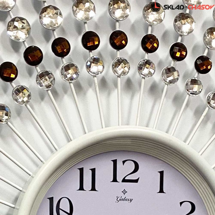 Большие необычные настенные часы GALAXY AYP-1055-B белого цвета с белым и золотым декором, имеют надежный бесшумный кварцевый механизм, работающий от батарейки типа АА (пальчиковые). Эта модель идеально подойдет для дома в гостиную комнату разных стилей, включая современный и декор. Временные рамки обозначены арабскими цифрами. Стрелки под стеклом.