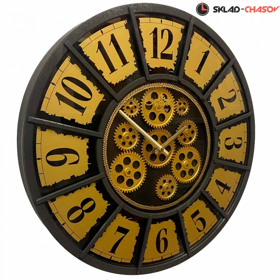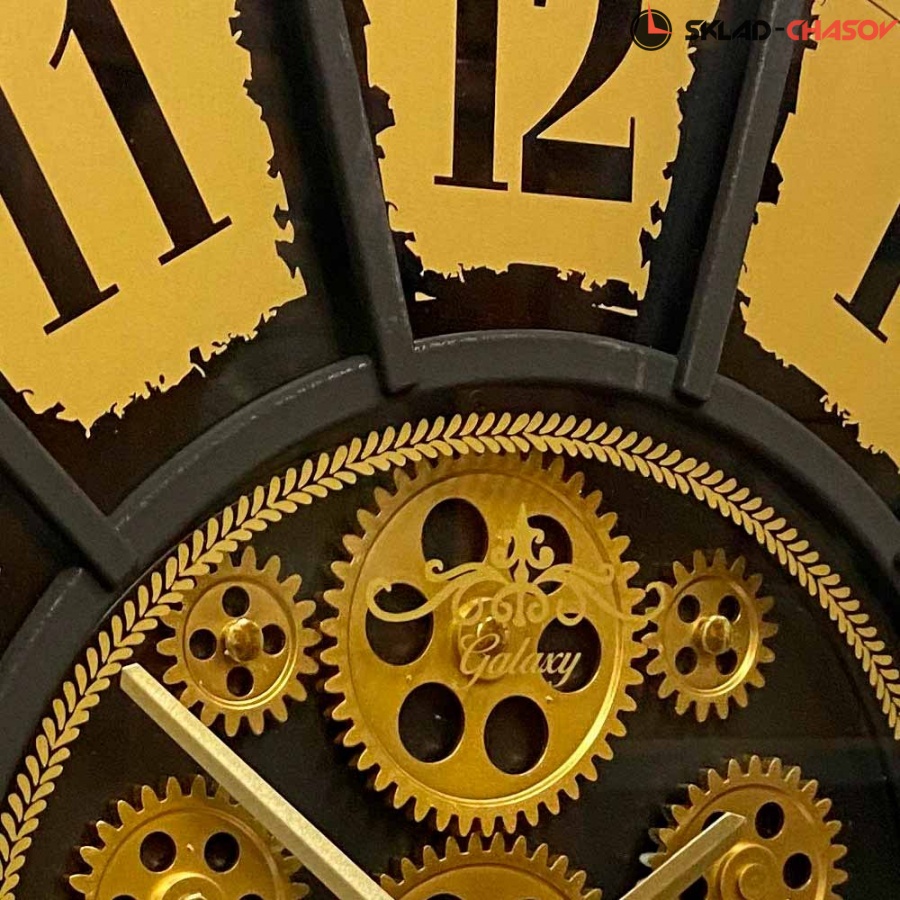 Настенные часы с шестеренками GALAXY CRK-500-K золотого цвета имеют надежный бесшумный кварцевый механизм, работающий от батарейки типа АА (пальчиковые).