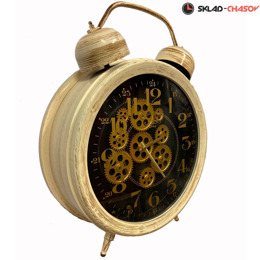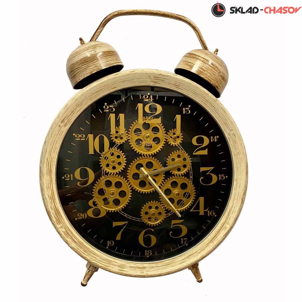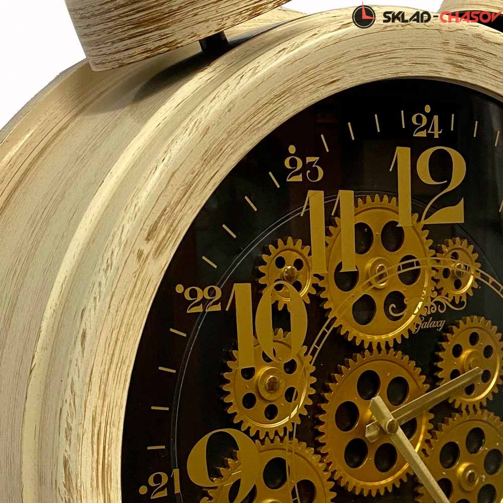 Настенные часы в виде будильника с шестеренками GALAXY CRK-600-03 антично-золотистого цвета имеют надежный кварцевый механизм, работающий от батарейки типа АА (пальчиковые).