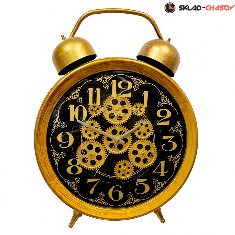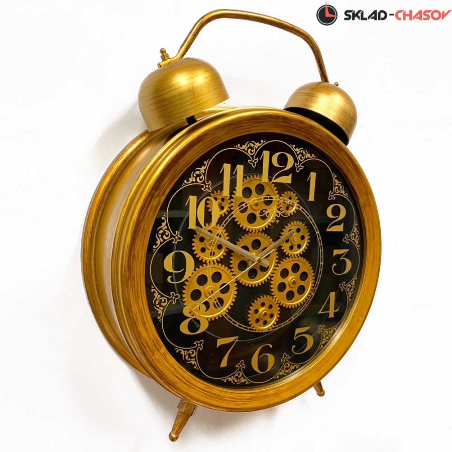 Настенные часы в виде будильника с шестеренками GALAXY CRK-600-03 антично-золотистого цвета имеют надежный кварцевый механизм, работающий от батарейки типа АА (пальчиковые).