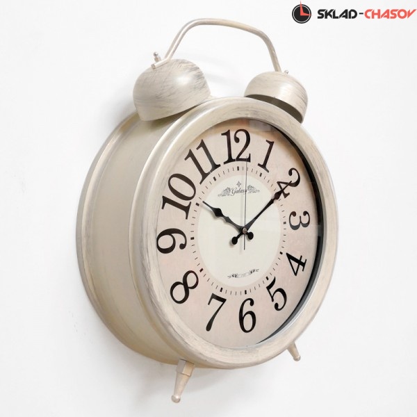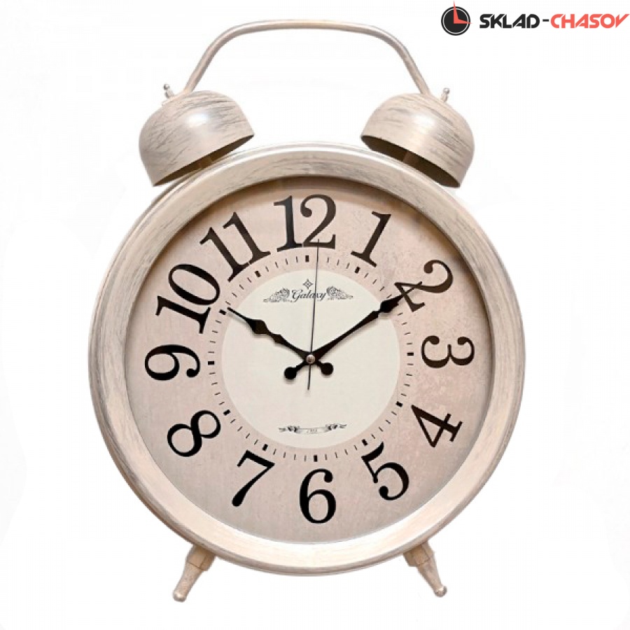 Настенные часы GALAXY D-600-05 в виде будильника цвета Слоновая кость с патиной подойдут как для установки на стол,так их можно повесить на стену. Имеют надежный бесшумный кварцевый механизм, работающий от батарейки типа АА (пальчиковые). Эта модель идеально подойдет для дома в гостиную и детскую комнату разных стилей, включая восточный и под старину. Временные рамки обозначены арабскими цифрами.