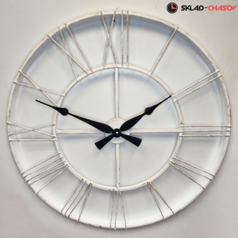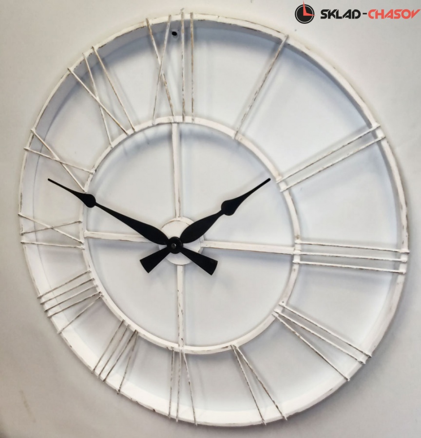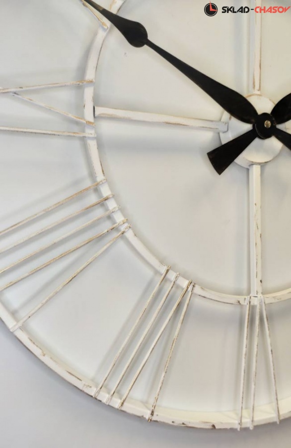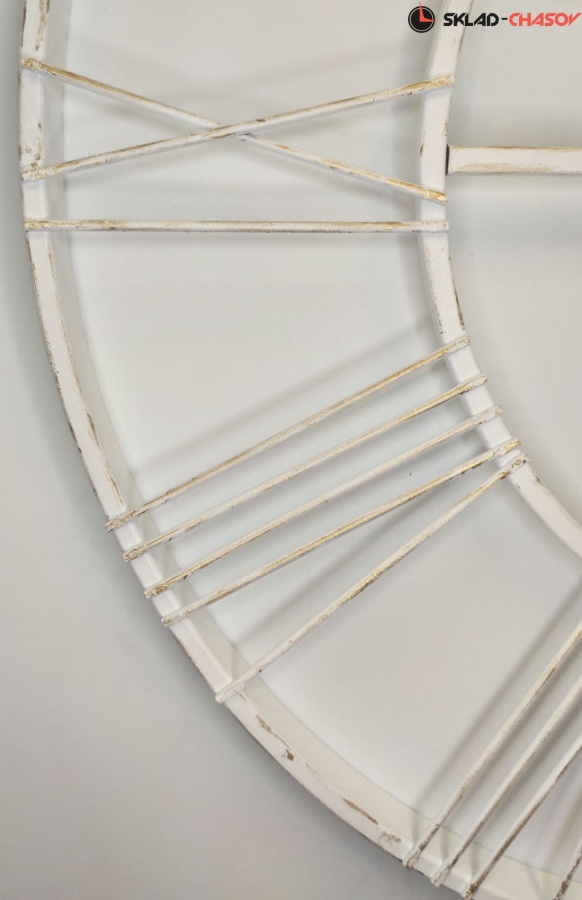 Настенные большие металлические часы DM-100-White-PG белого цвета с золотой патиной имеют надежный бесшумный кварцевый механизм, работающий от батарейки типа АА (пальчиковые). Эта модель идеально подойдет для дома в гостиную комнату разных стилей. Временные рамки обозначены римскими цифрами. Стрелки открытые, стекла нет.