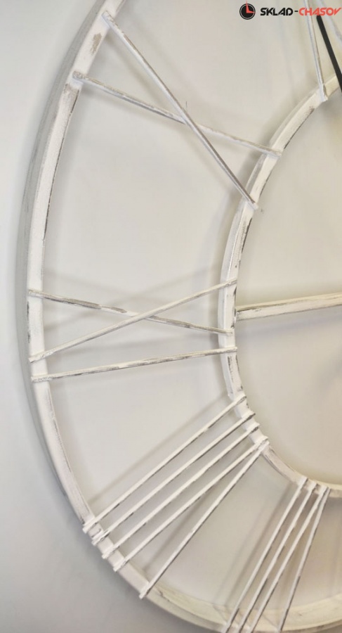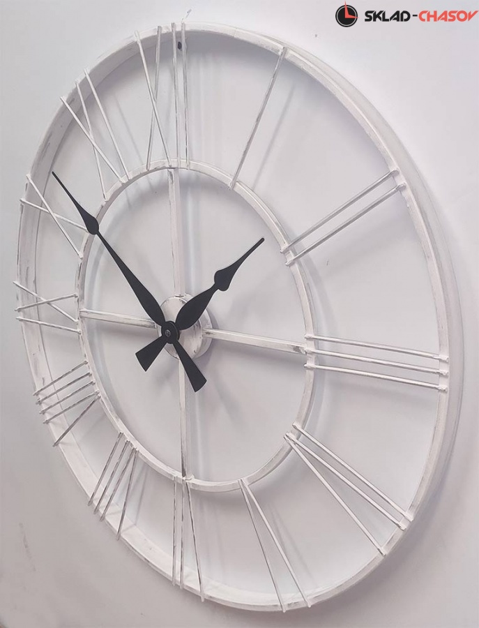 Настенные большие металлические часы DM-100-White-PS белого цвета с серебристой патиной , размер 70 см, имеют надежный бесшумный кварцевый механизм, работающий от батарейки типа АА (пальчиковые). Эта модель идеально подойдет для дома в гостиную комнату разных стилей. Временные рамки обозначены римскими цифрами. Стрелки открытые, стекла нет.