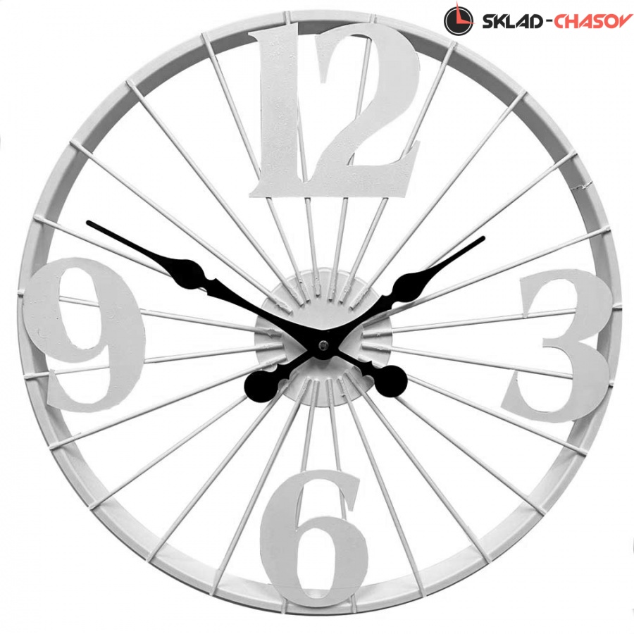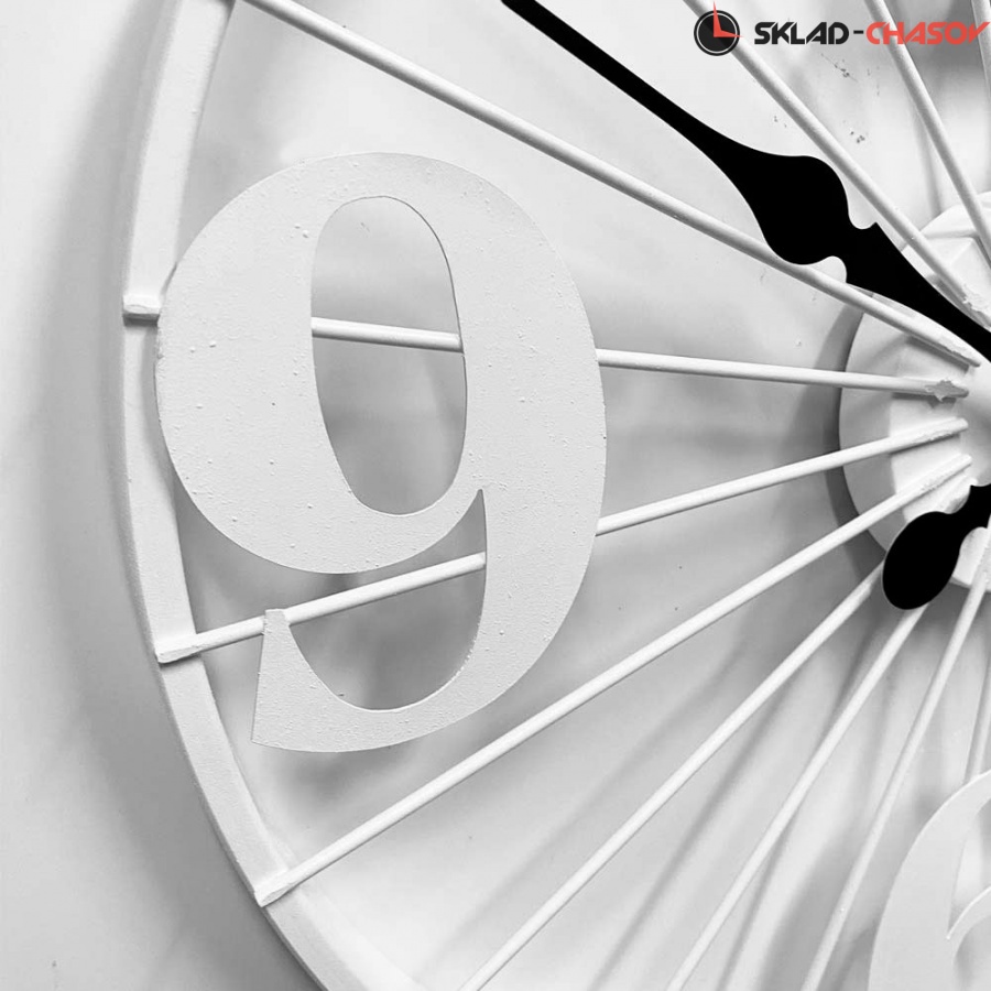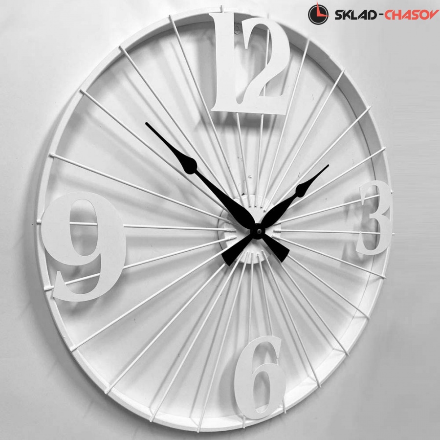 Настенные большие металлические часы DM-60 White белого цвета имеют надежный бесшумный кварцевый механизм, работающий от батарейки типа АА (пальчиковые). Эта модель идеально подойдет для дома в гостиную комнату разных стилей.