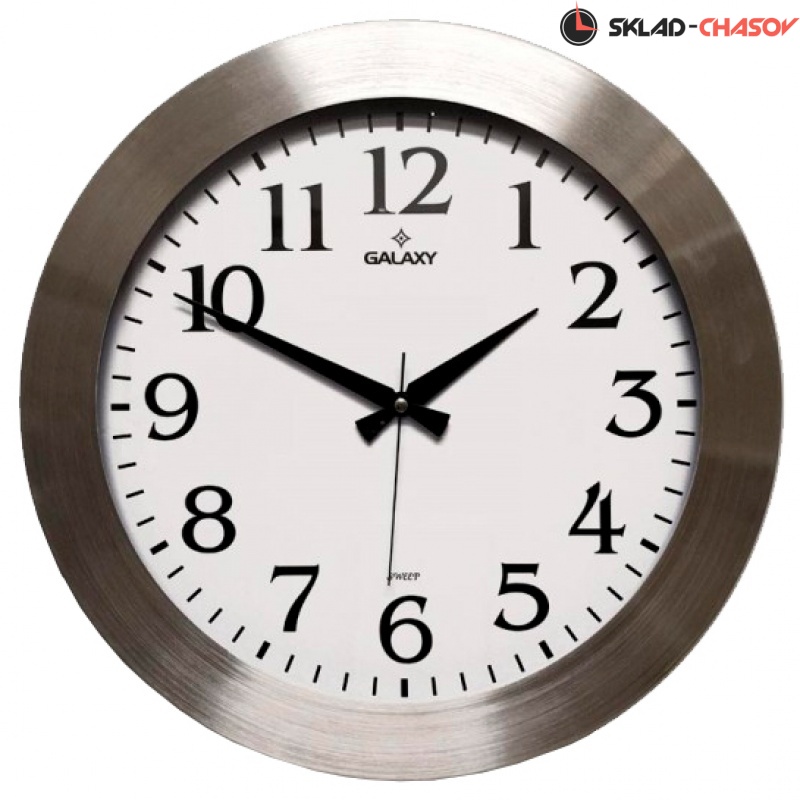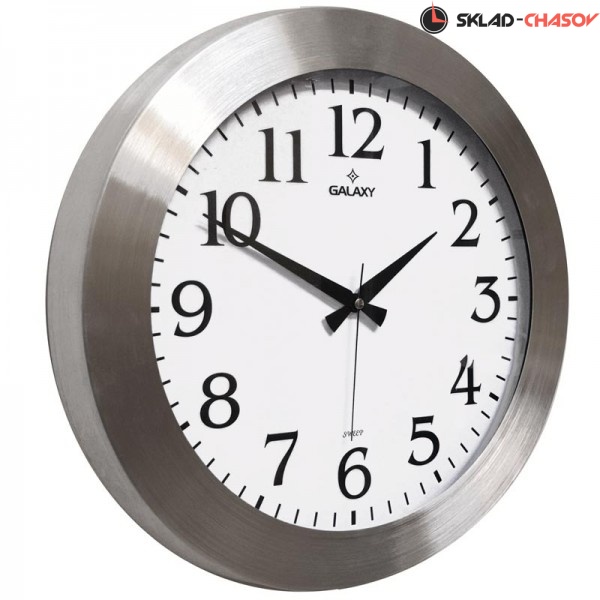 Настенные часы GALAXY M-1962-A из металла серебряного цвета большого диаметра имеют надежный бесшумный кварцевый механизм, работающий от батарейки типа АА (пальчиковые). Эта модель идеально подойдет для дома в гостиную комнату, для офиса, в торговые залы, вокзалы, аптеки, рестораны, кафе и другие большие помещения. Временные рамки обозначены арабскими цифрами.