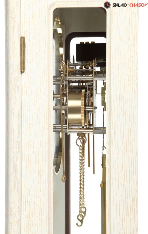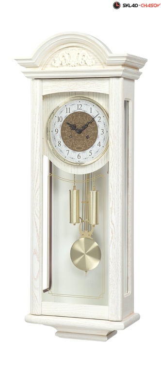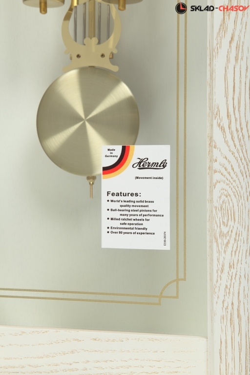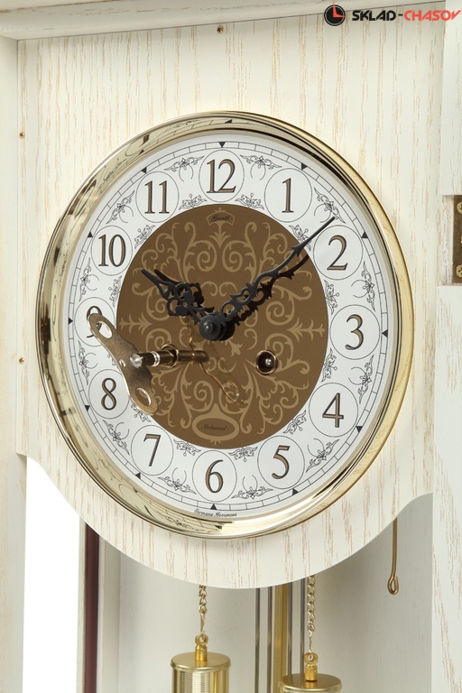 Настенные часы с маятником и боем в деревянном корпусе с немецким механизмом Hermle М-50510-104/ Корпус настенных часов сделан из массива дуба и покрыт лаком белого цвета с золотой патиной.