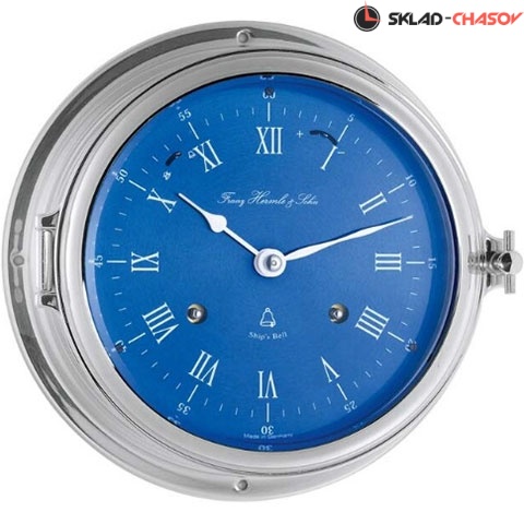 Механические настенные часы с пружинным подзаводом на 8 дней. Корабельный гонг, получасовой бой - 1 удар, каждый час удары по количеству полных часов. Ручное отключение боя в ночное время. Римский циферблат синего цвета. Минутная разметка.