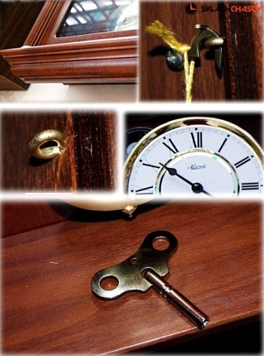 Мелодия Westminster каждый час и четверть часа. Бой получасовой и каждый час по количеству полных часов. Настраиваемое отключение на ночь. Регулировка громкости мелодии. Регулятор - маятник.