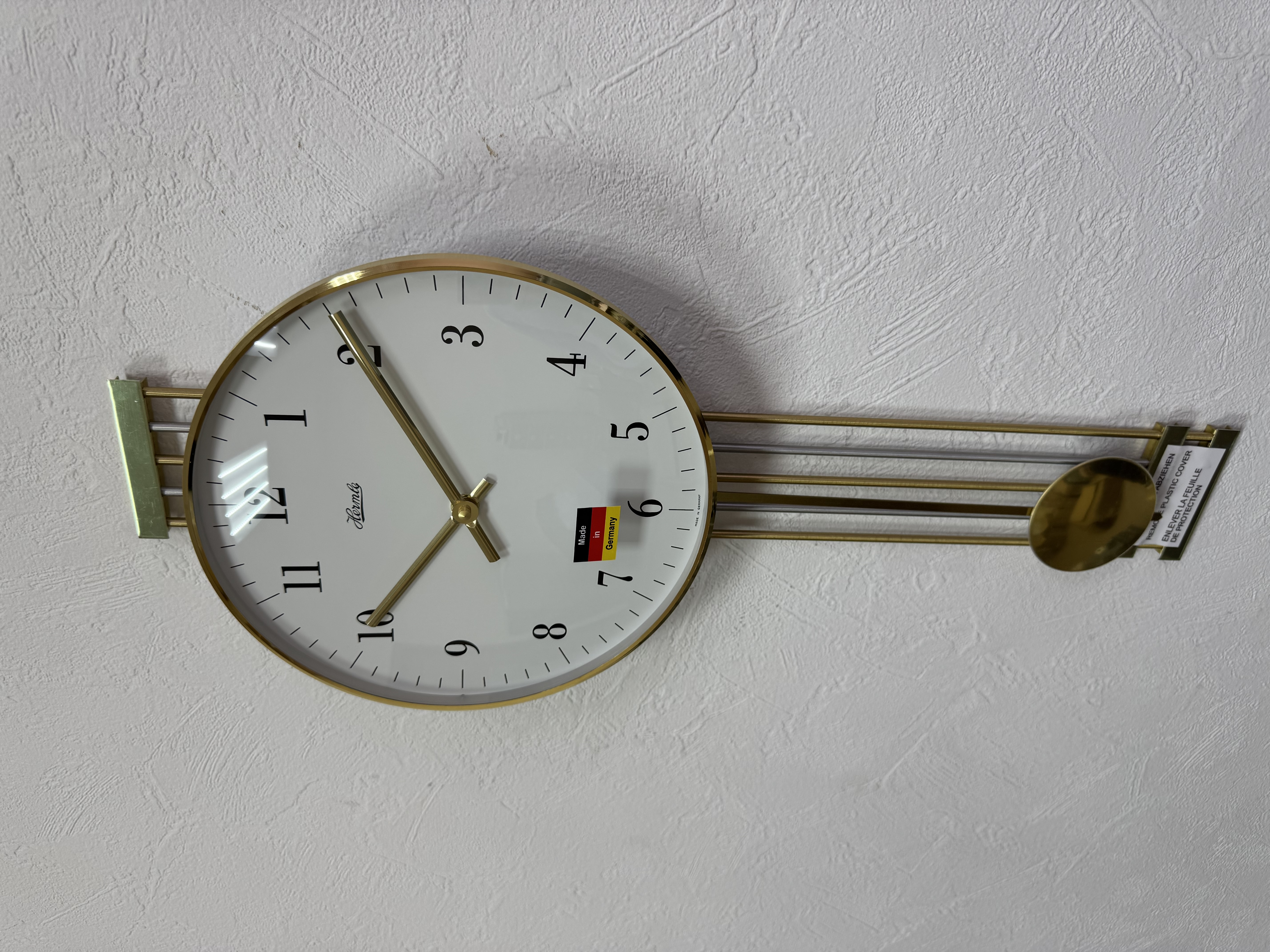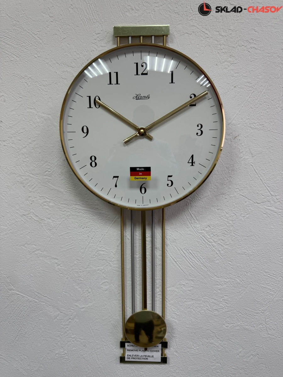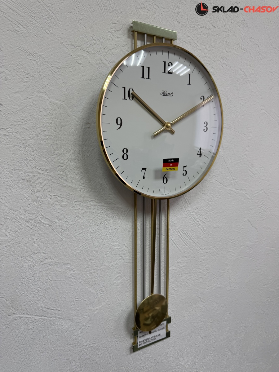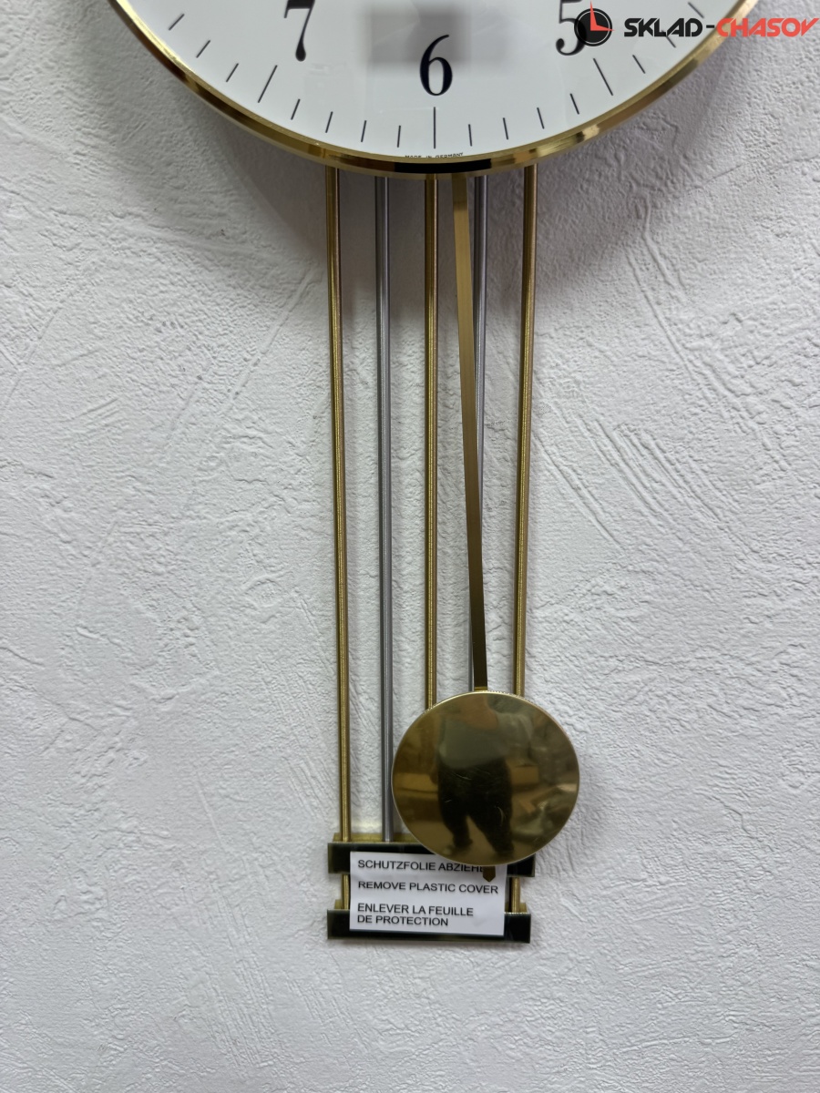 Корпус выполнен из металла золотистого покрытием. Классический круглый белый циферблат закрыт стеклом с золотистым ободом. Временные рамки обозначены большими арабскими цифрами. Маятник отполирован. Отлично будут смотреться в офисе, дома или на кухне.