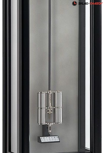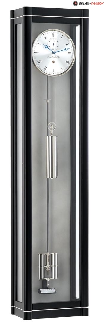 Механические настенные часы с пружинным подзаводом на 31 день. Тип механизма: механический, прецизионный, тросовый. Корпус часов изготовлен из массива немецкой ольхи, металла, стекла. Серебристый циферблат с римскими цифрами, синими стрелками. Гири изготовлены из вольфрама, что делает их очень тяжелыми и обеспечивает низкую частоту колебаний маятника, необходимую для месячной работы часов. Специально разработанный высокоточный механизм, позволяет заводить часы 1 раз в месяц. При этом погрешность хода составляет до 10 секунд в месяц. Шесть подшипников и два рyбинa анкерного колеса снижают трение до минимума.