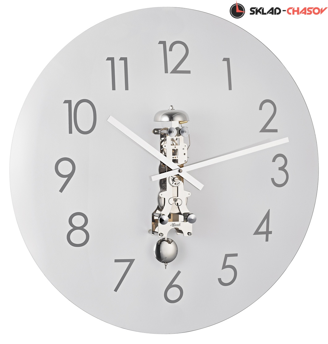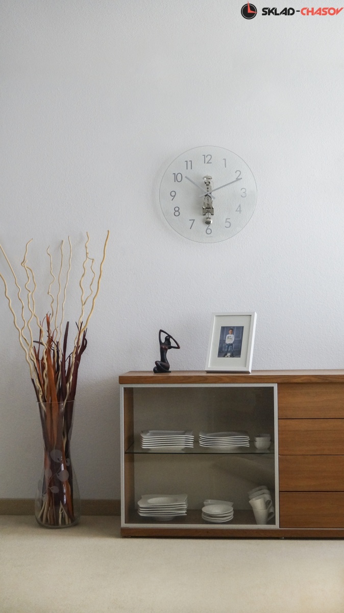 Большие механические часы с механизмом-скелетоном. Корпус-циферблат выполнен из стекла с нанесёнными на него крупными цифрами.