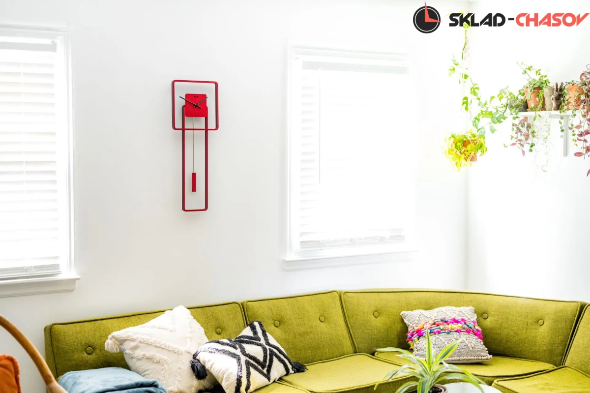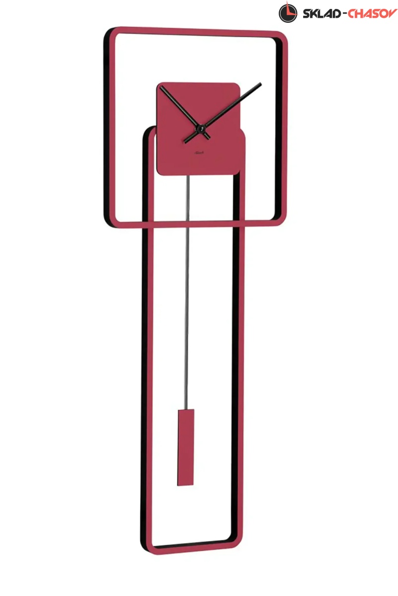 Современные кварцевые настенные часы элегантного дизайна в красно-черном корпусе с маятником в сочетании с определенной пуристической ноткой.