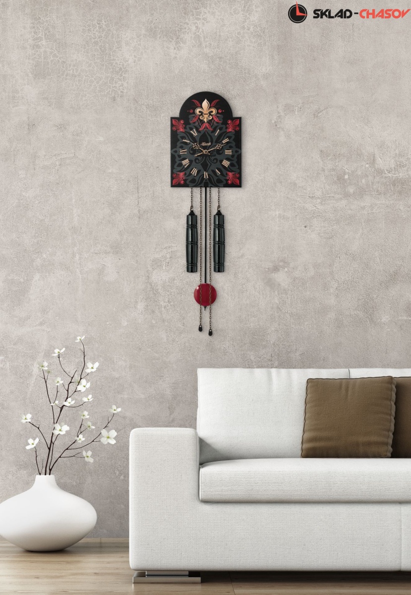 Деревянные часы shield выполнены в современном темном стиле и оснащены механическим механизмом с 8-дневным циклом хода и часовым перезвоном на колокольчике. Гирька выполнена в черном цвете, диск с маятником - в красном, а цепочка - в черном.