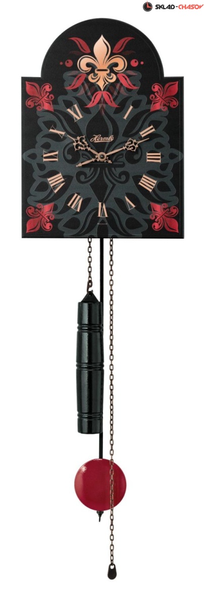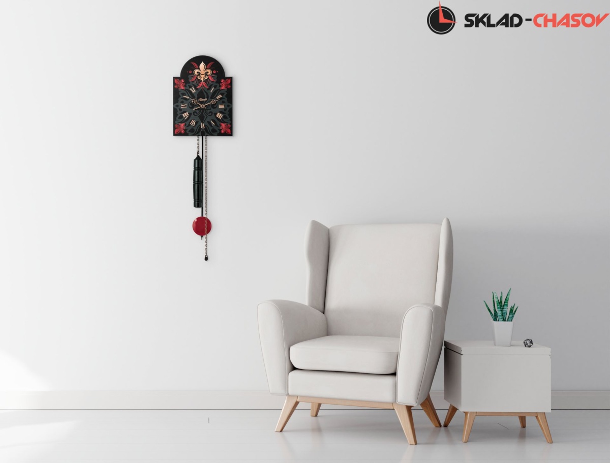 Деревянные часы shield выполнены в современном темном стиле и оснащены механическим механизмом с 8-дневным циклом хода и часовым перезвоном на колокольчике. Гирька выполнена в черном цвете, диск с маятником - в красном, а цепочка - в черном.