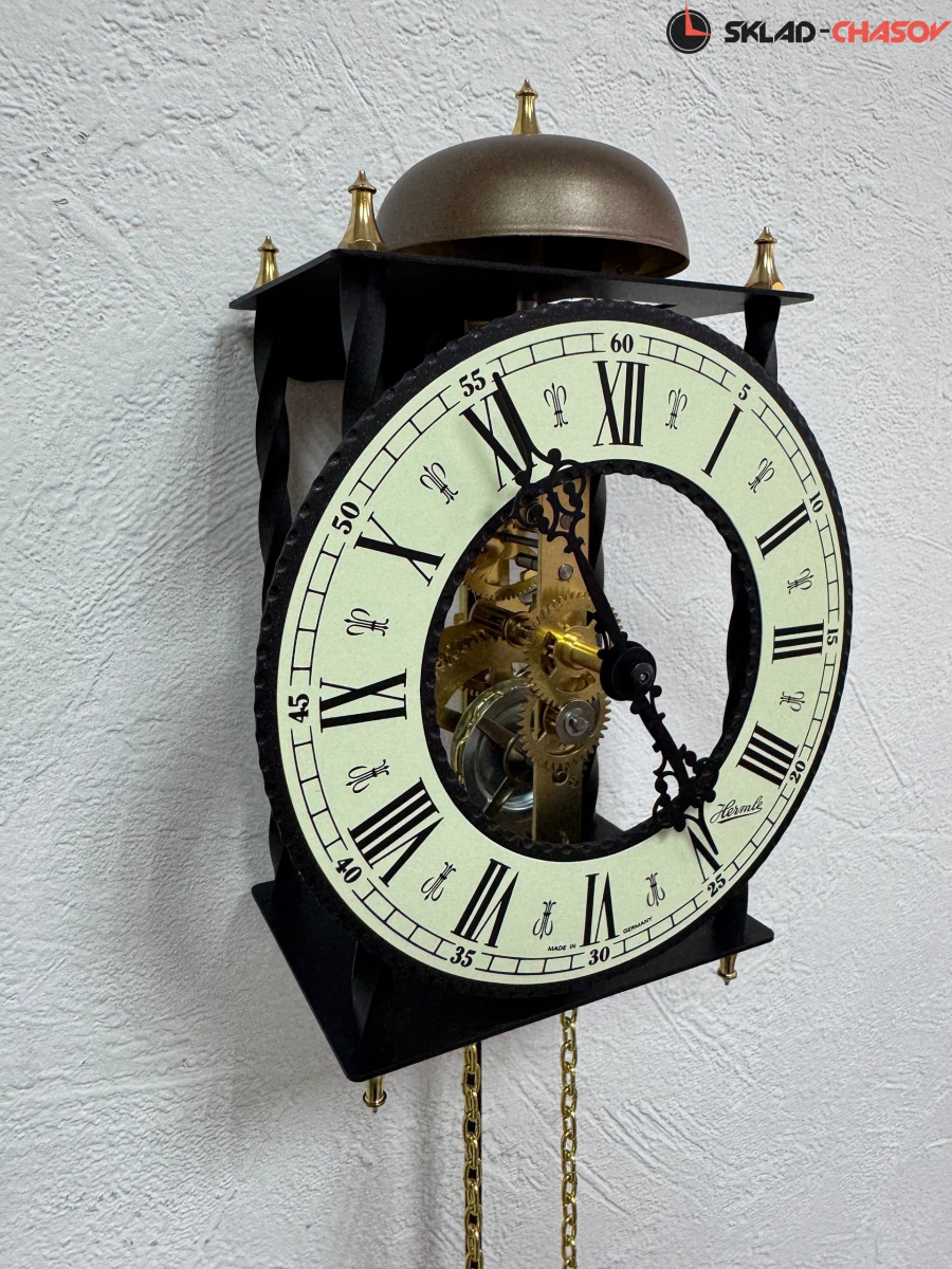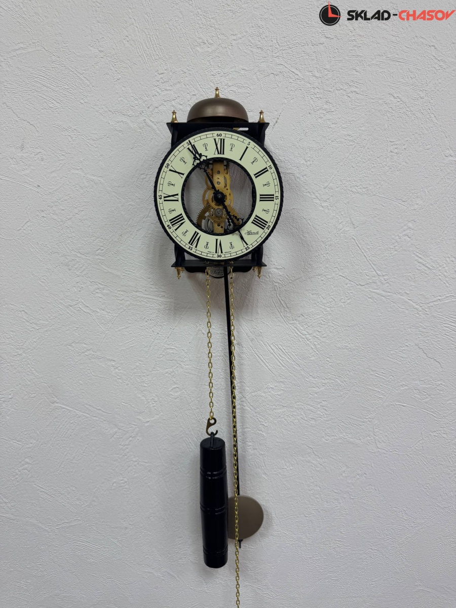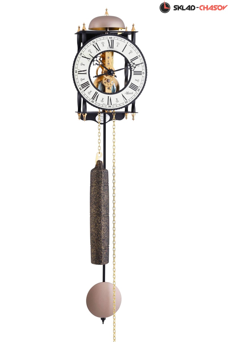 Механизм-скелетон с 8-дневным запасом хода позволяет оценить изящество и точность механизма. Бой: 1 удар каждый час по колокольчику. Изготовлен из кованного железа в сочетании с латунью.