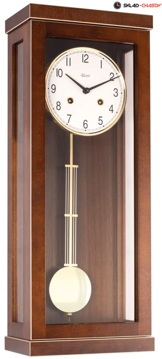 Корпус часов изготовлен из массива дерева и частично покрыт шпоном. Модель тонирована в цвете орех с контрастными гранями. Боковые стекла. Четкий арабский циферблат. Длительность завода 14 дней. Получасовой бой, ручное отключение боя.