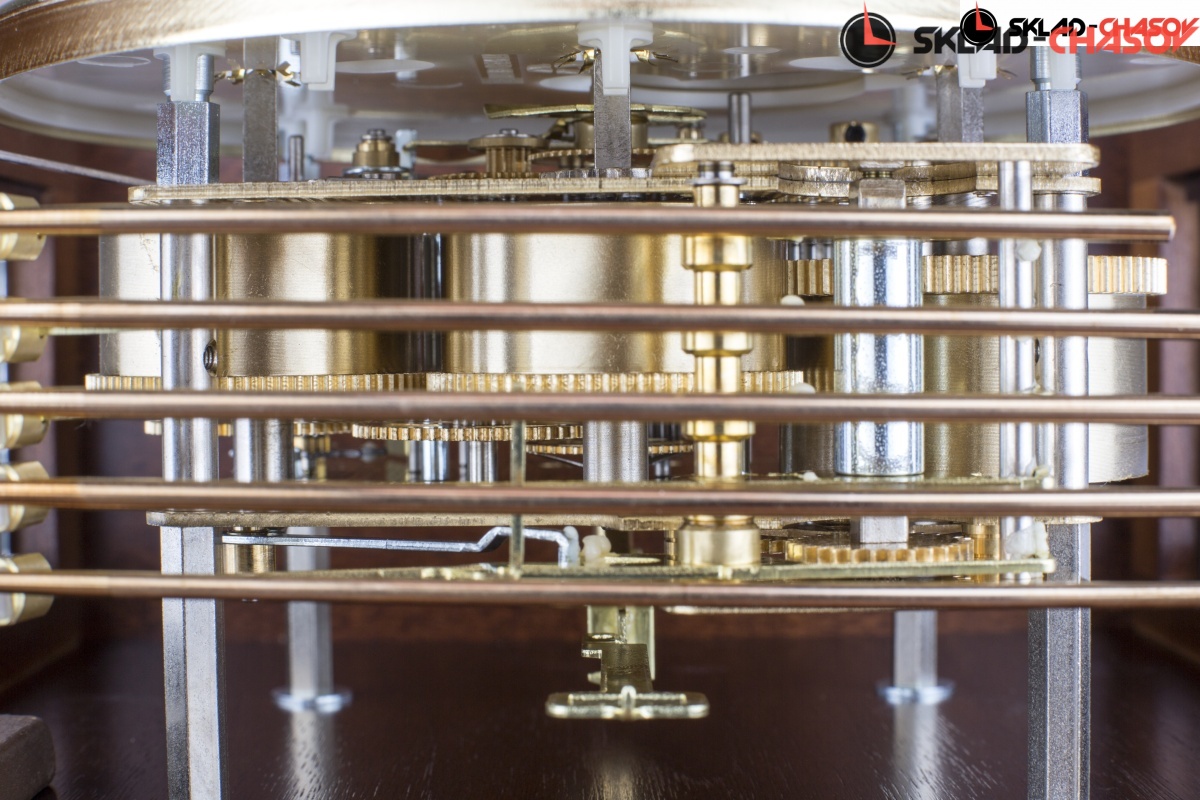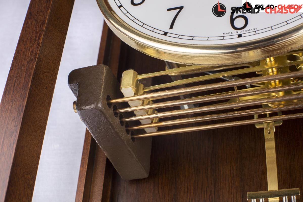 Корпус часов изготовлен из массива дерева и частично покрыт шпоном. Модель цвета орех с контрастными гранями. Боковые стекла. Четкий арабский циферблат. Длительность завода 8 дней. Мелодия Westminster каждые 15 минут, бой по количеству часов ровно в час.