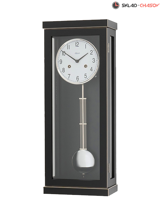Корпус часов изготовлен из массива дерева и частично покрыт шпоном. Модель черного цвета с контрастными гранями. Боковые стекла. Четкий арабский циферблат. Длительность завода 8 дней. Мелодия Westminster каждые 15 минут, бой по количеству часов ровно в час.