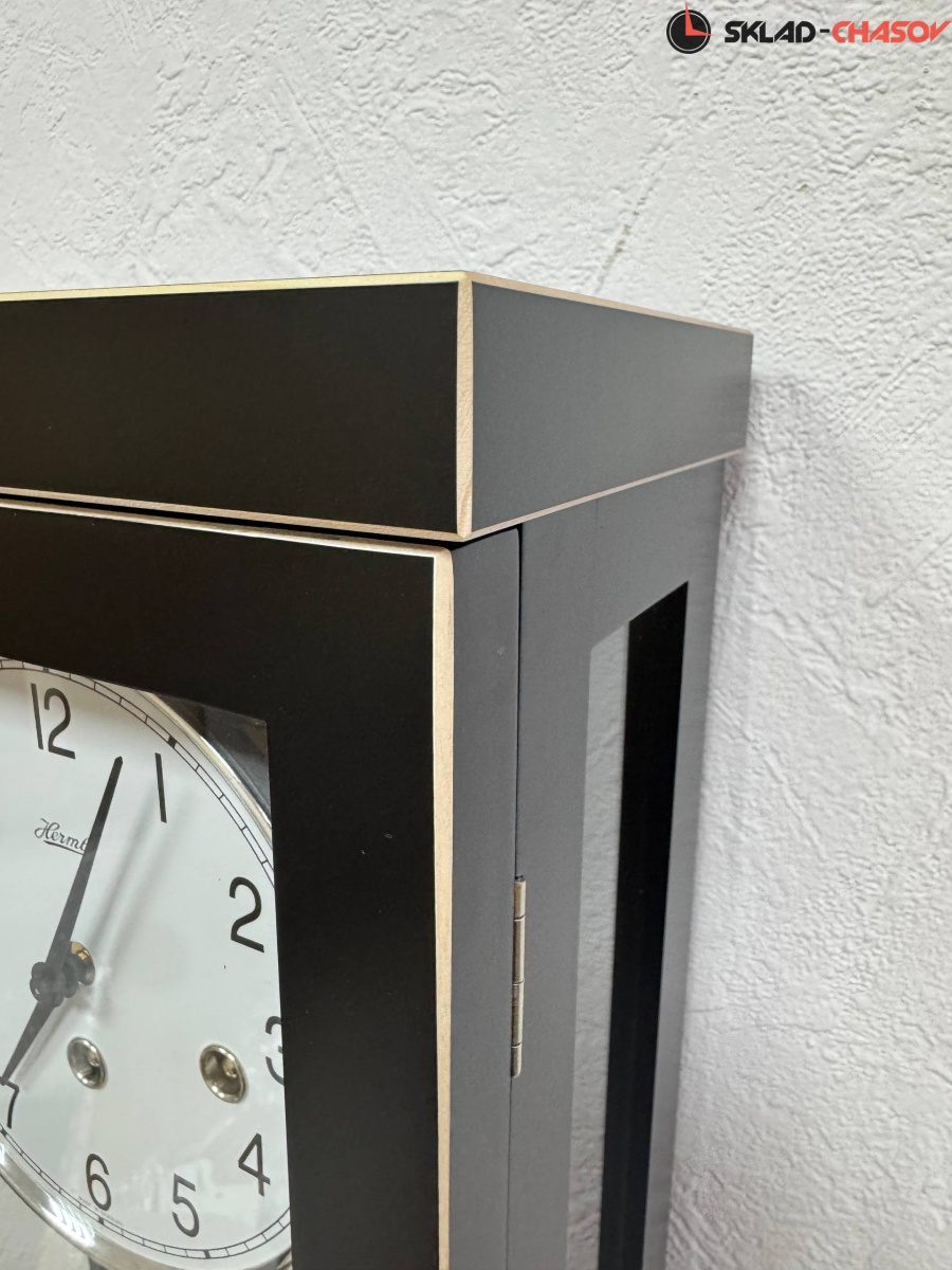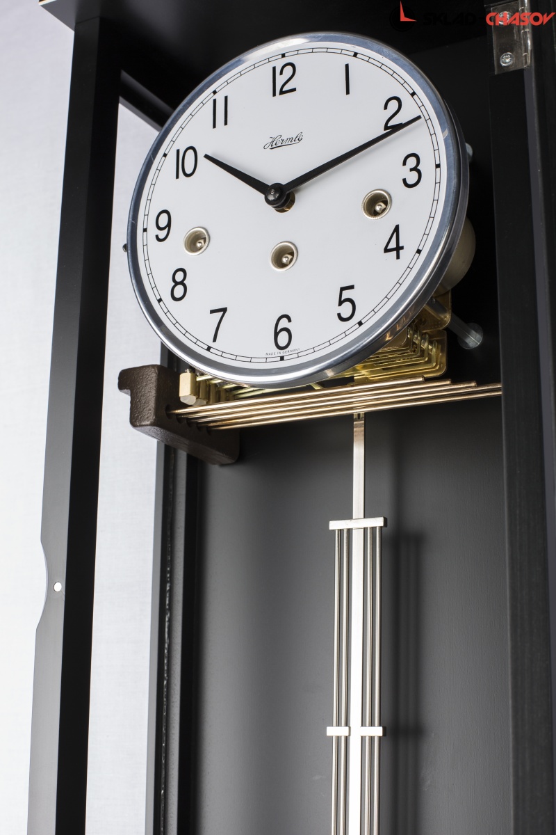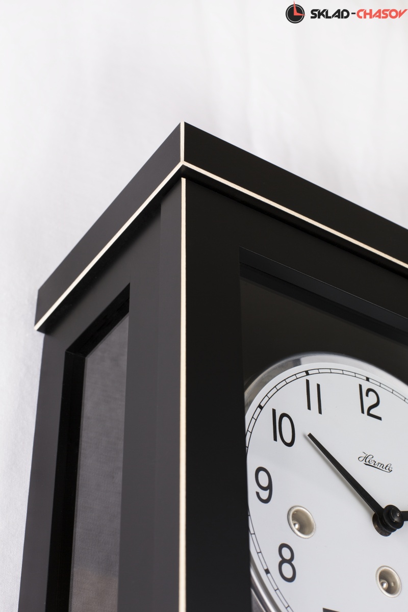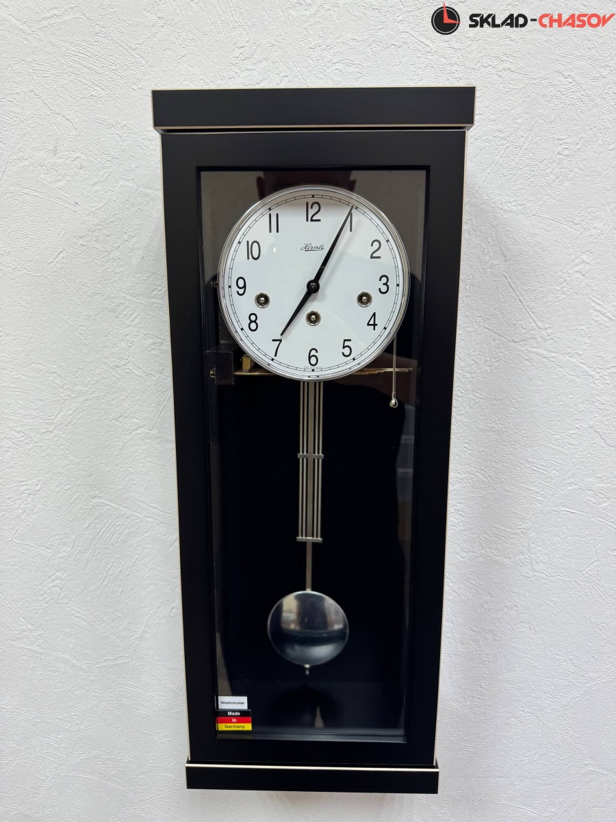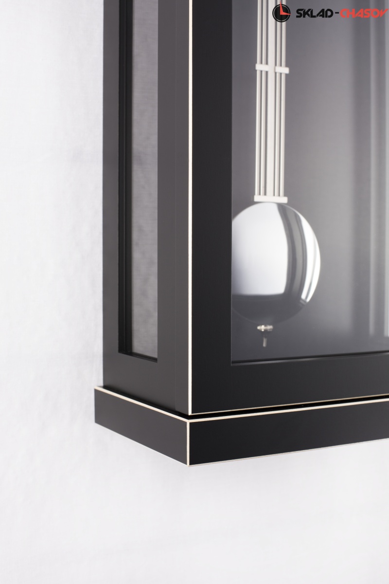 Корпус часов изготовлен из массива дерева и частично покрыт шпоном. Модель черного цвета с контрастными гранями. Боковые стекла. Четкий арабский циферблат. Длительность завода 8 дней. Мелодия Westminster каждые 15 минут, бой по количеству часов ровно в час.