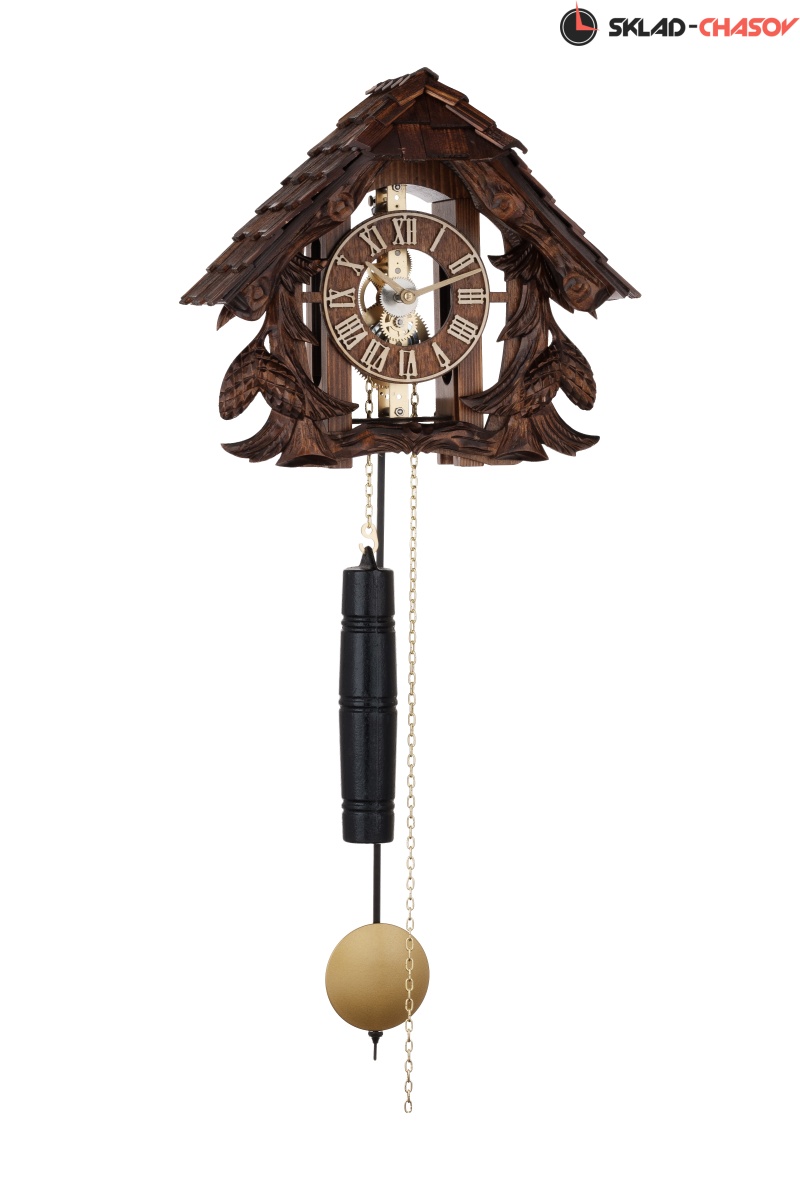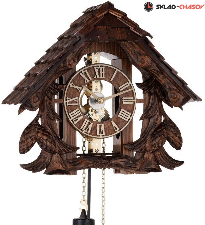 Эффектные механические часы с ручным заводом, выполненные в виде резного деревянного домика, добавят в интерьер комнаты выразительный акцент.