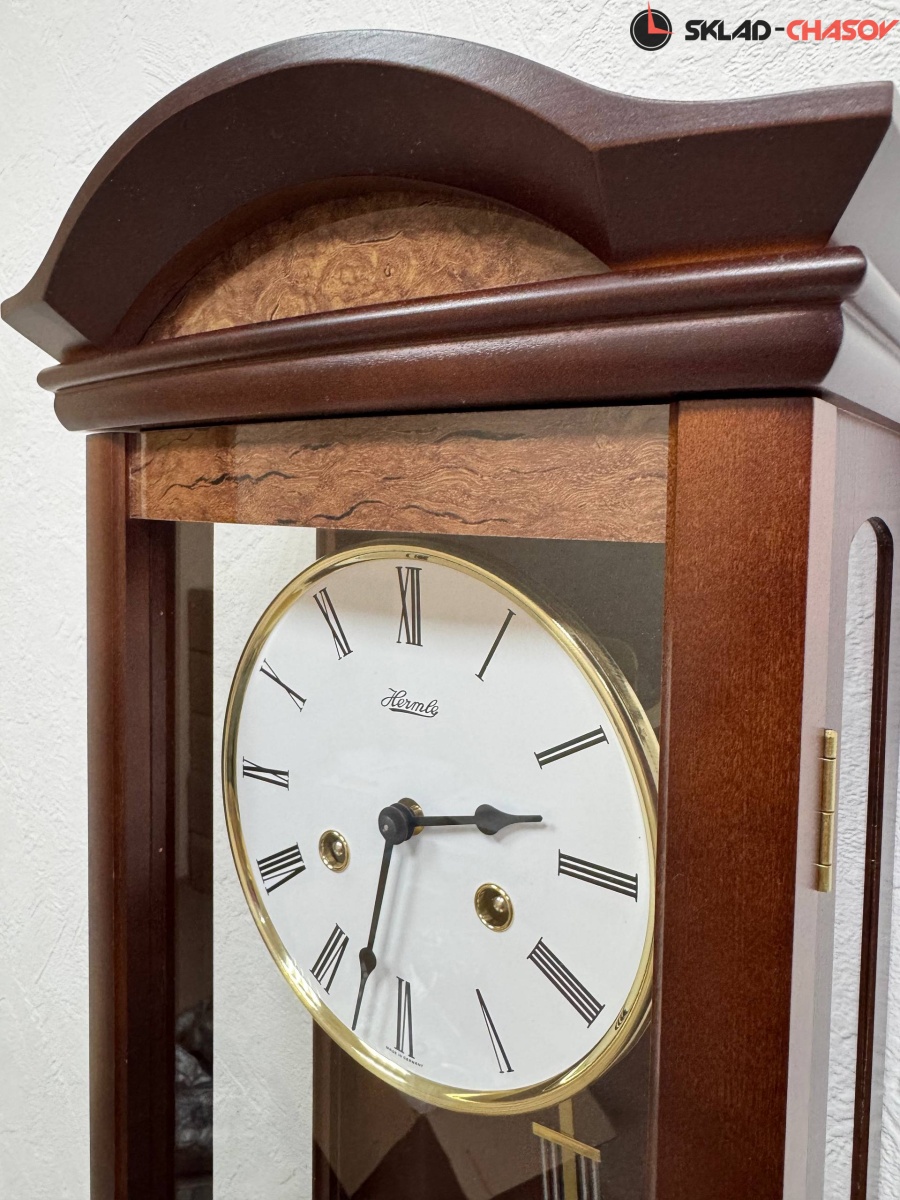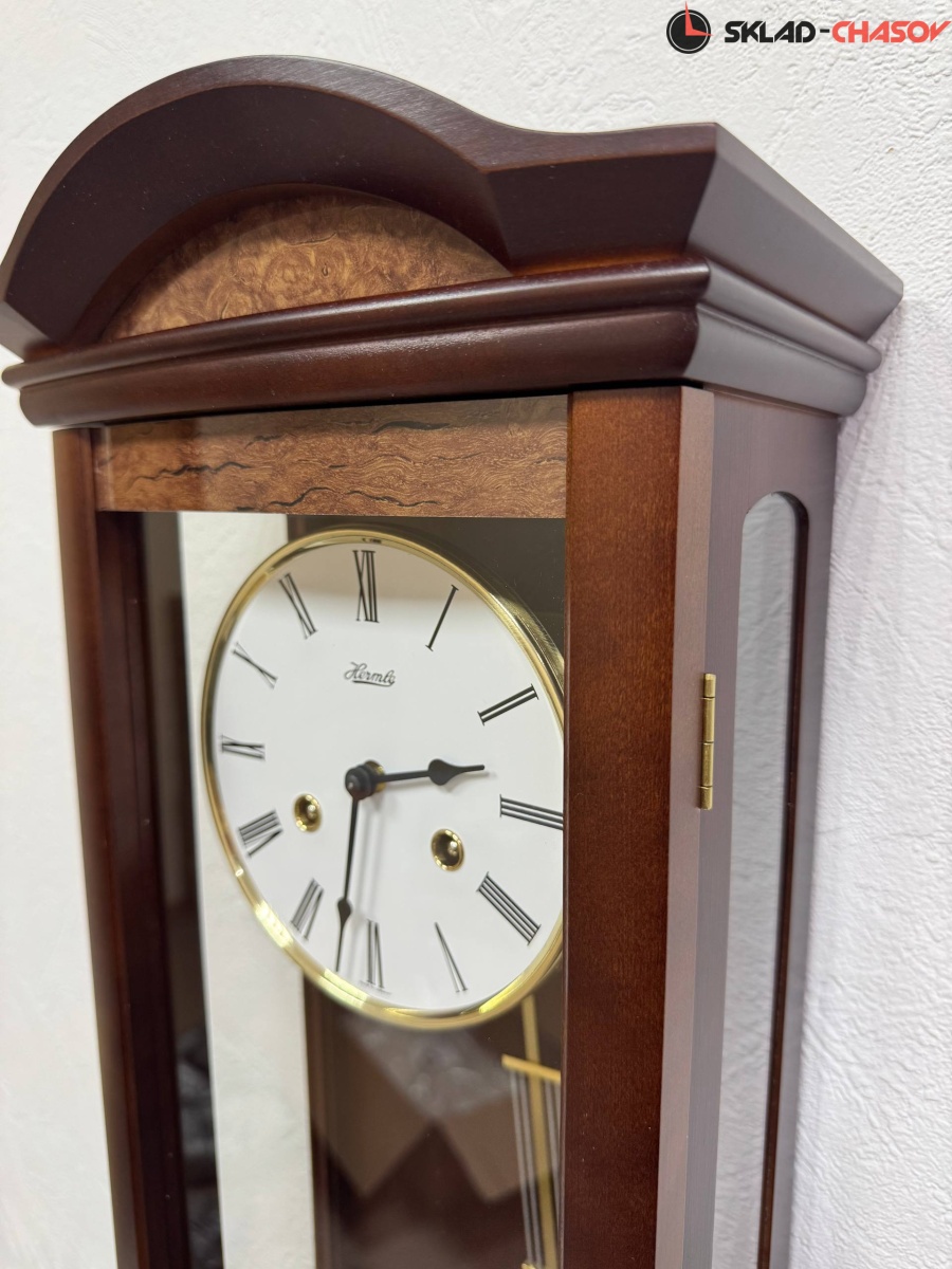 Механические часы с маятником в корпусе из массива дерева, с боковыми стёклами и декоративной отделкой фронтальной панели корневищем ореха.