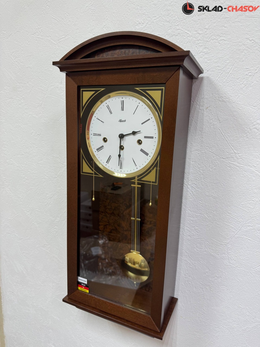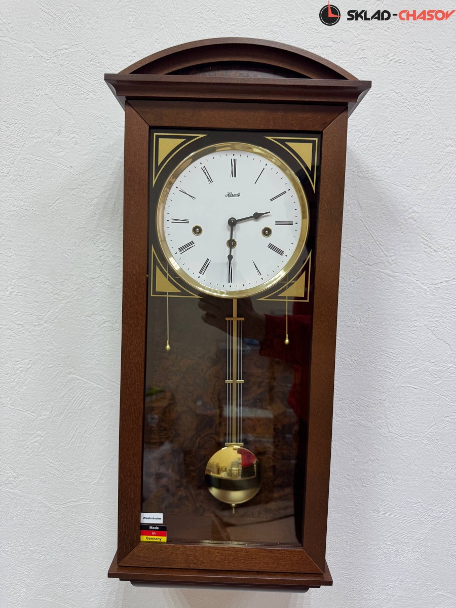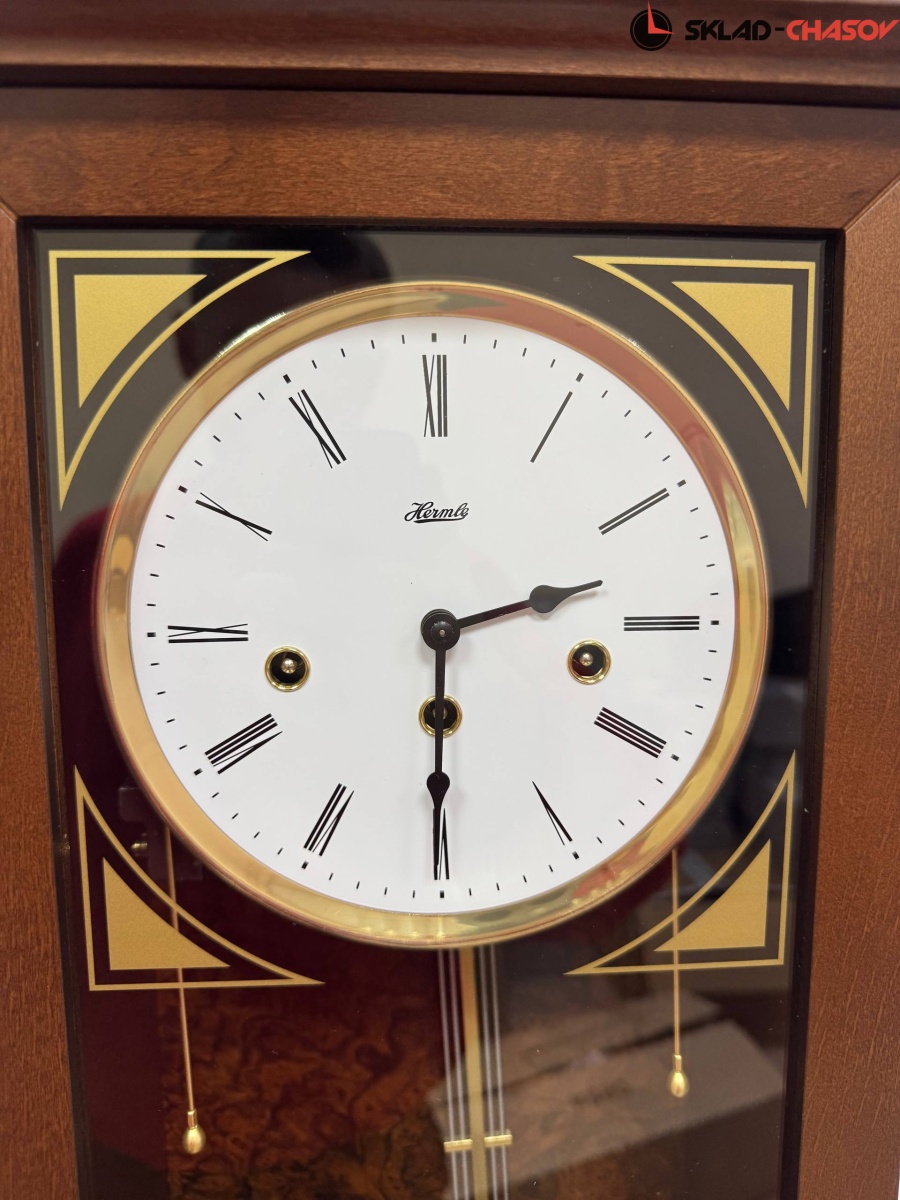 Настенные часы механические Hermle. Деревянный корпус. Мелодия Westminster играет каждые 15 минут, бой каждый ровный час. Длительность завода 8 дней. Пружинный механизм с маятником. Ручное и автоматическое отключение боя. Циферблат белого цвета с контрастными стрелками, римскими цифрами.