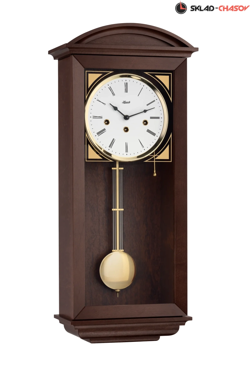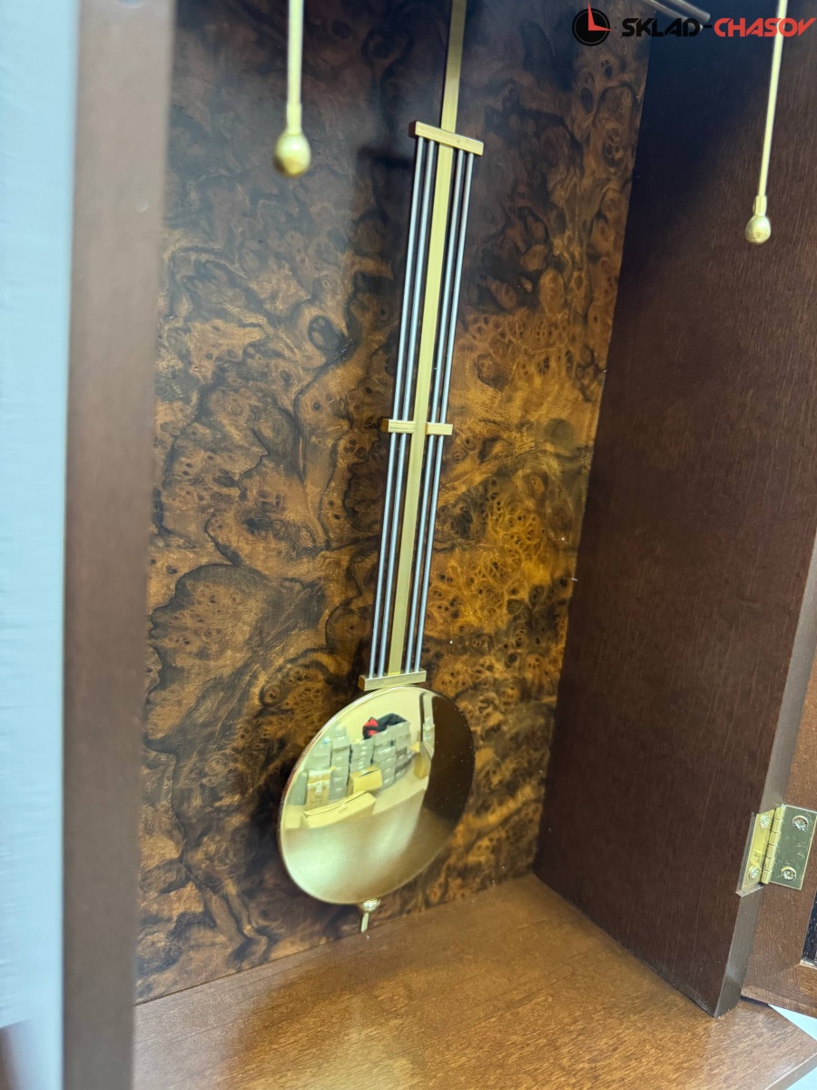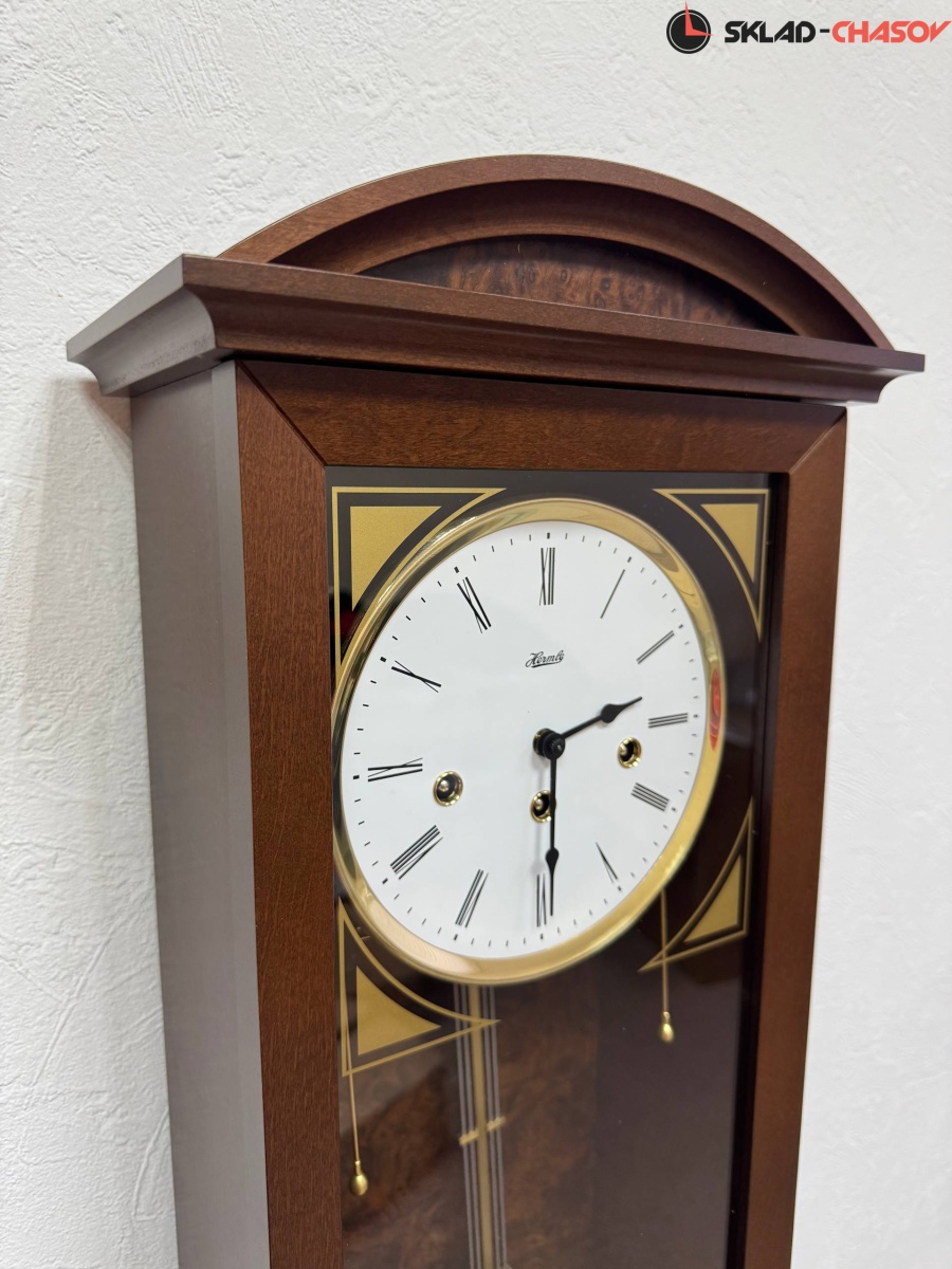 Настенные часы механические Hermle. Деревянный корпус. Мелодия Westminster играет каждые 15 минут, бой каждый ровный час. Длительность завода 8 дней. Пружинный механизм с маятником. Ручное и автоматическое отключение боя. Циферблат белого цвета с контрастными стрелками, римскими цифрами.