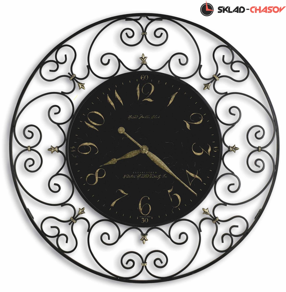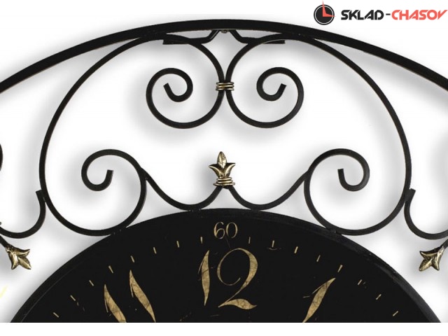Выразительные настенные часы диаметром 91,4см. Черный кованый корпус с декоративными завитушками и орнаментом из цветков ириса, в отделке также использованы золотые оттенки.