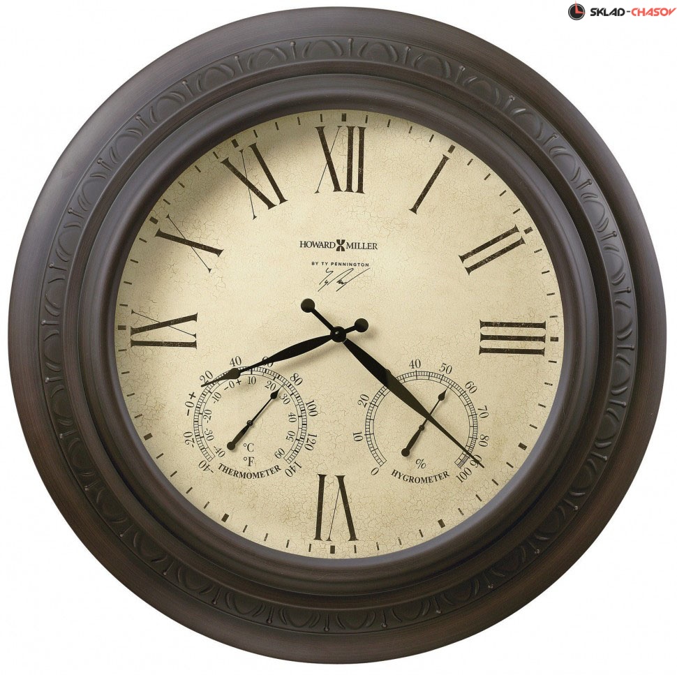 Настенные часы Howard Miller 625-464.Корпус выполнен из металла и отделан искусственно состаренной медью, украшен рельефным декором Круглый циферблат искусственно состарен.На циферблате стоит автограф дизайнера Тая Пеннигтона.Часы оборудованы термометром и гигрометром.Временные рамки обозначены большими римскими цифрами .