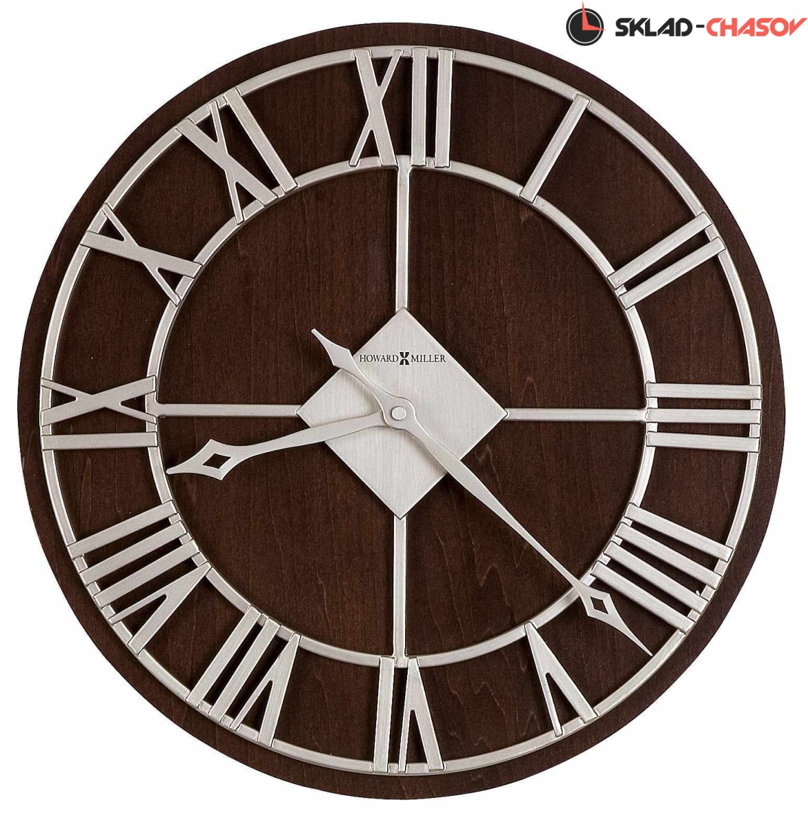 Настенные часы из металла Howard Miller 625-496 Prichard. Металлические настенные часы диаметром 38,1 см. Задняя панель отделана в цвете Эспрессо (Espresso), остальные элементы отделаны матовым никелем.Циферблат с чеканными римскими цифрами, а также часовая и минутная стрелки с наконечниками в форме бриллиантов покрыты матовым никелем.Кварцевый механизм. Требуется 1 батарейка типа АА (не включена в поставку).