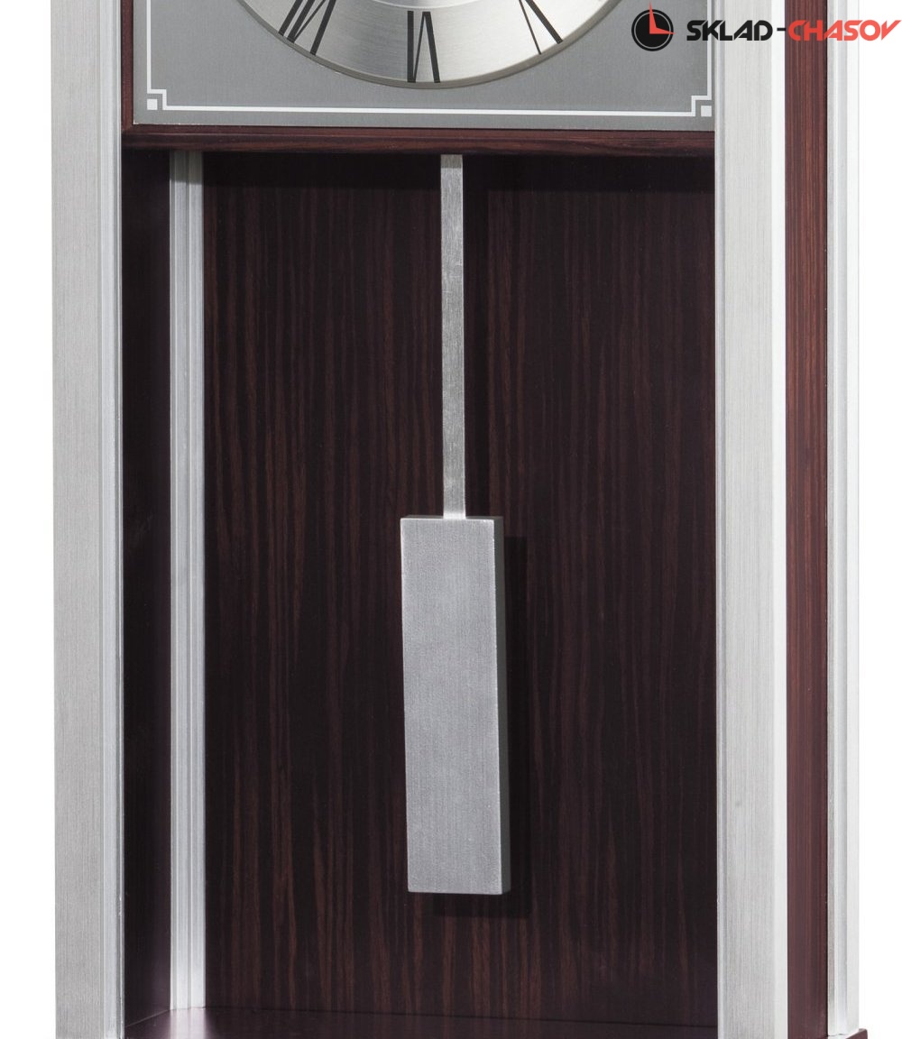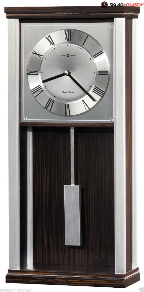 Настенные часы Howard Miller 625-541 Brody (Броди). В часах Howard Miller 625-541 есть три мелодии на выбор. В этих настенных часах матовый алюминий и покрытие цвета полированного серебра прекрасно сочетается с древесиной эбенового дерева, шпоном которого отделаны верхняя и нижняя части часов. Циферблат покрыт матовым алюминием, черные римские цифры и часовые деления. Простой формы, прямоугольный маятник расположен под циферблатом и отделан в цвете полированного серебра.