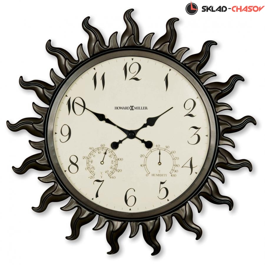 Настенные часы из металла Howard Miller 625-543 Sunburst II.Эти настенные часы диаметром 57,15 см в виде солнца предназначены для использования в помещении или на улице.Оправа часов в виде солнца с лучами изготовлена из металла, покрытого специальным порошковым напылением. Закаленное стекло и резиновые уплотнения надежно защищают внутренность часов от внешних климатических воздействий.Два дополнительных циферблата показывают температуру и относительную влажность.Циферблат молочного цвета, черные арабские цифры, черные часовая и минутная стрелки.Кварцевый механизм, требуется 1 батарейка типа АА (не включена в поставку).