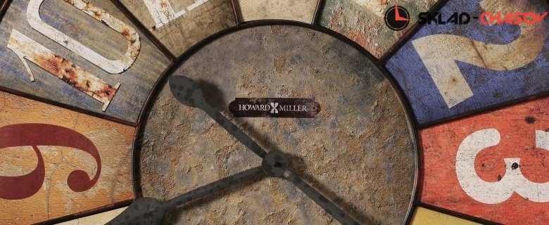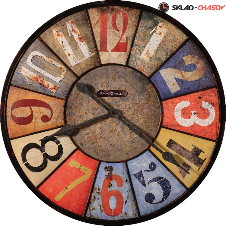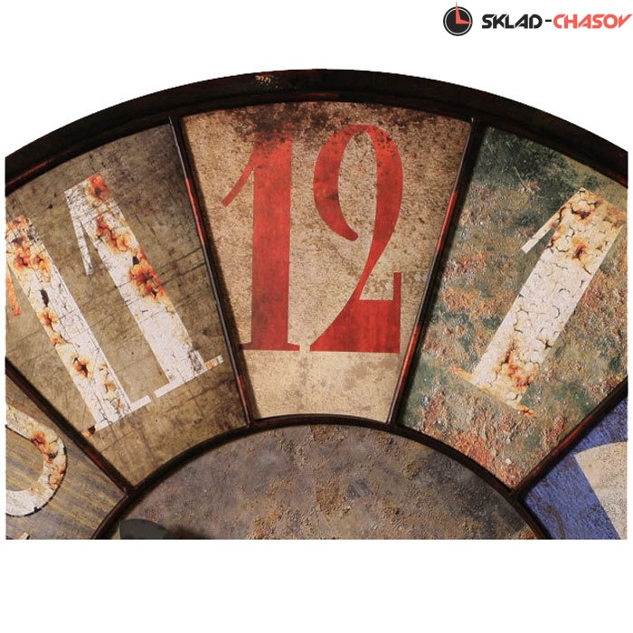 Искусственно состаренный циферблат с несколькими панелями, покрашенными в разные цвета, уникальные разноцветные арабские цифры.