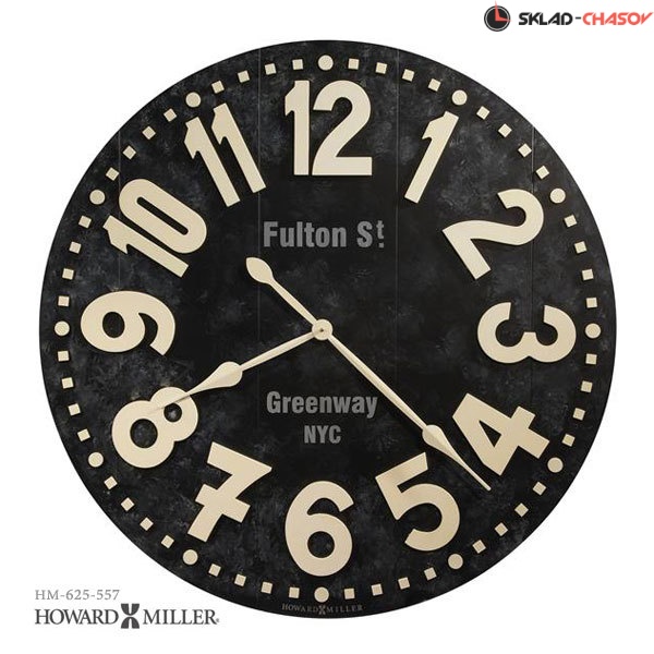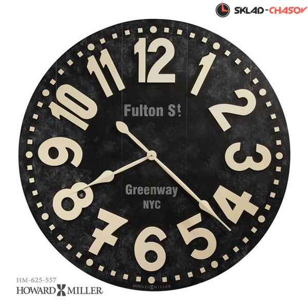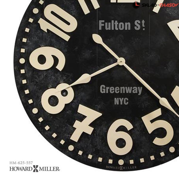 Настенные часы Howard Miller 625-557 Fulton Street (Фултон Стрит).Это галерейные часы большого размера черного цвета искусственно состарены, на циферблате надпись "Fulton St., Greenway NYC". Рельефные арабские цифры, минутная шкала и пикообразные часовая и минутная стрелки отделаны в цвете слоновой кости и создают интересный контраст с циферблатом.