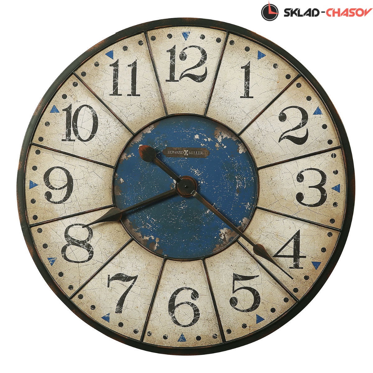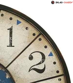 Настенные часы Howard Miller 625-567. Это настенные часы большого размера изготовлены из металла, отделаны в черном цвете, искусственно состарены и имитируют тронутую временем потертую поверхность с оттенками меди.На фоне искусственно состаренного белого циферблата эффектно смотрятся черные арабские цифры и минутные деления, состаренный центральный диск синего цвета и треугольные часовые деления.Пикообразные часовая и минутная стрелки отделаны в черном цвете и искусственно состарены.