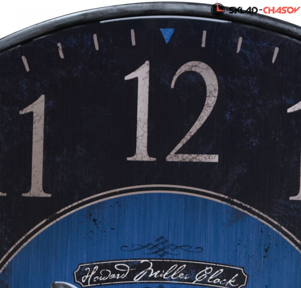 Настенные часы Howard Miller 625-568 Harmon II (Хармон II). Это настенные галерейные часы диаметром 66,7 см. представляют собой циферблат, выполненный в двух цветах: кобальтовом синем и черном, отделаны под «антик» и обрамлены металлической оправой под «античный никель» .Визирное отверстие для маятника расположено на месте часового деления «6», окантовано ободком под «античный никель» и закрыто стеклом. Сам маятник также отделан под «античный никель».Пикообразные часовые стрелки, выполненные в том же античном стиле, придают этим часам ностальгическую нотку.