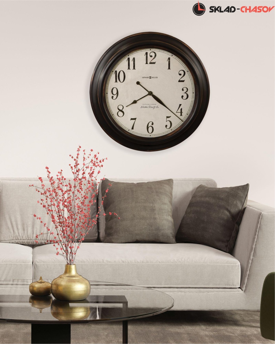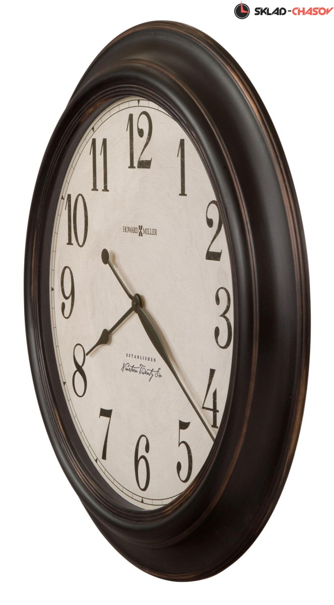 Часы могут похвастаться формованой металлической рамой с бронзовыми потертостями, проступающими сквозь основной кофейный цвет. Рама обрамляет циферблат молочно-серого цвета с имитацией царапин и кракелюра. Крупные арабские цифры и металлические стрелки выполнены в выцветше-черном цвете и прекрасно сочетаются с общим стилем часов. Циферблат закрыт минеральным стеклом.