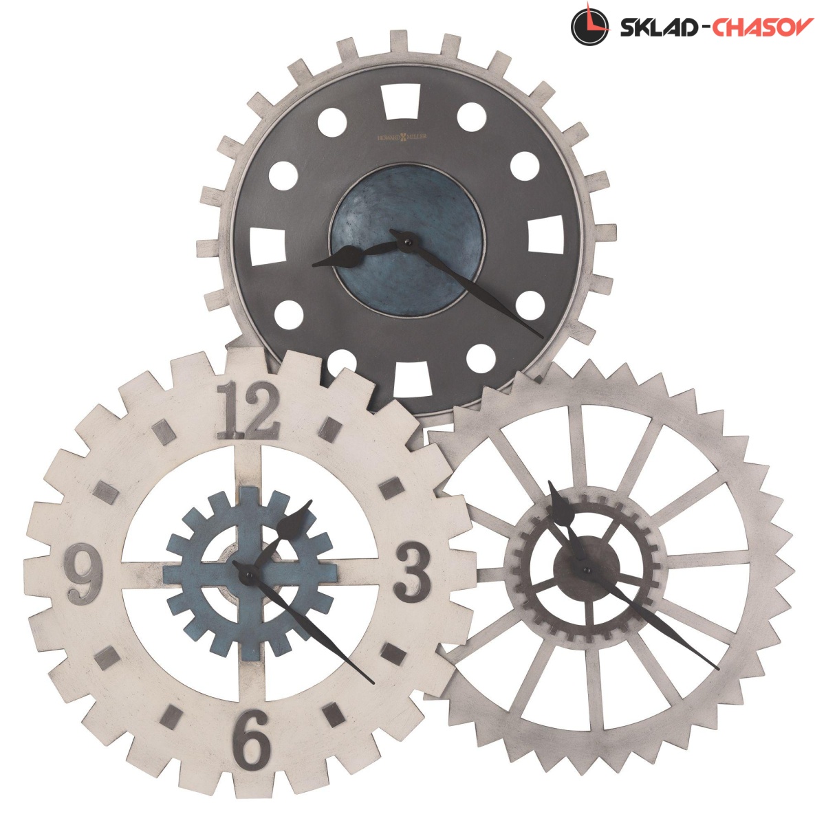 Данная модель больших настенных часов привнесет индустриальный стиль в Ваш интерьер. Часы представляют собой три больших шестерни, которые функционируют как циферблаты. На каждой шестерни установлен независимый часовой механизм, поэтому на них можно установить разное время. Эти часы станут точкой притяжения внимания в любой комнате.