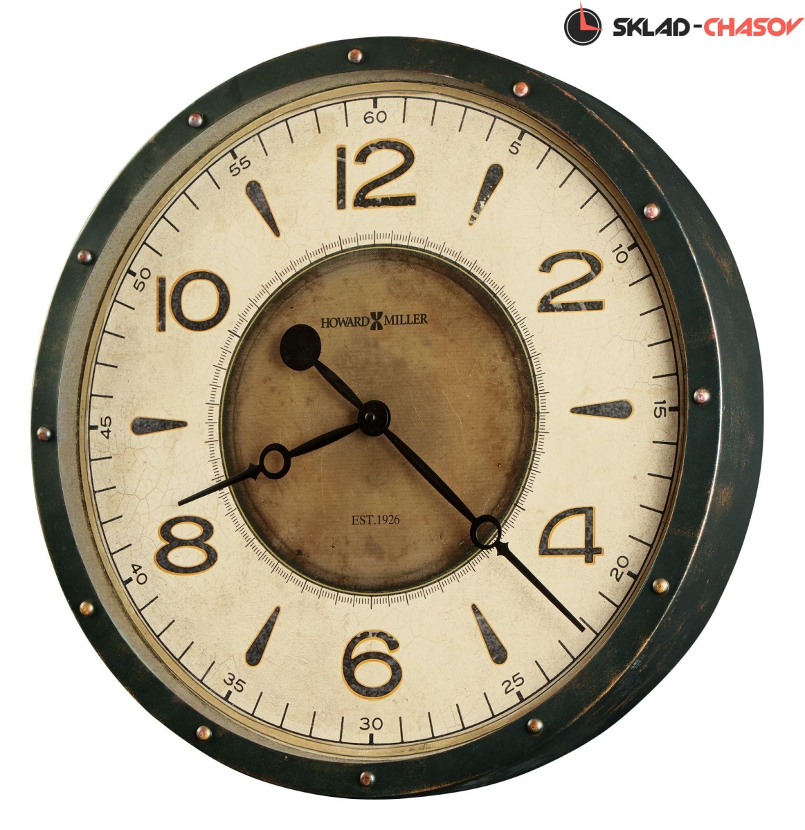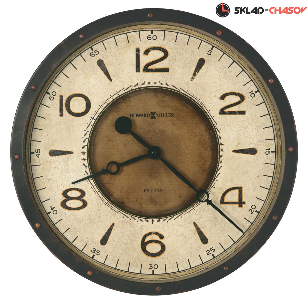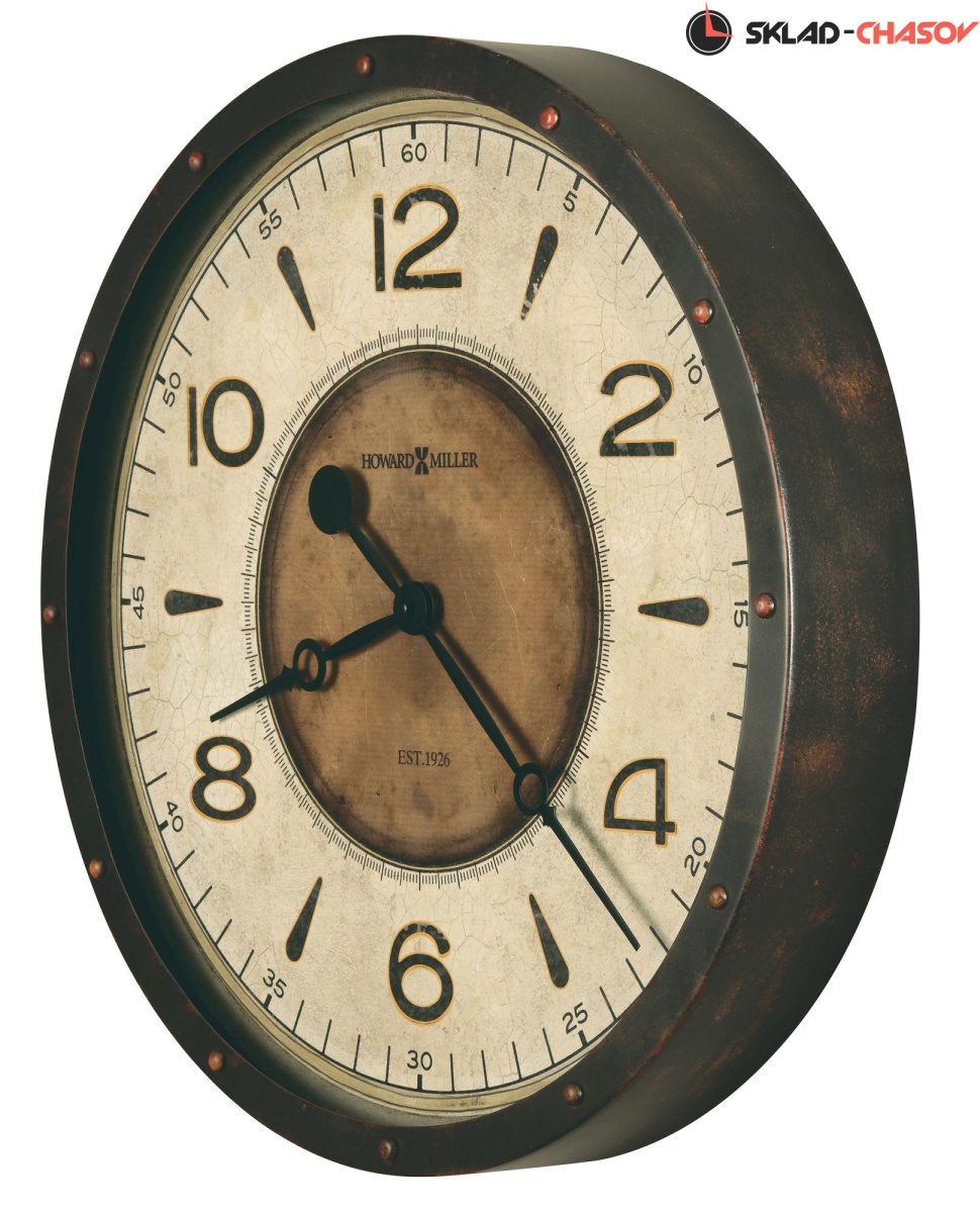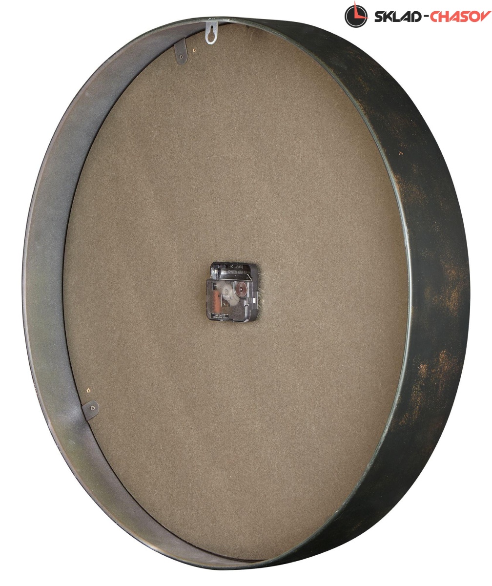 Корпус этих крупногабаритных часов выполнен из металла и отделан в черном цвете с эффектом старения. По краю корпуса, над часовыми метками размещены металлические заклепки с эффектом потертости. Циферблат выполнен с эффектом ржвчины, а его центр отделан под состаренную бронзу, что добавляет ощущения, что перед Вами, действительно, старинные часы.