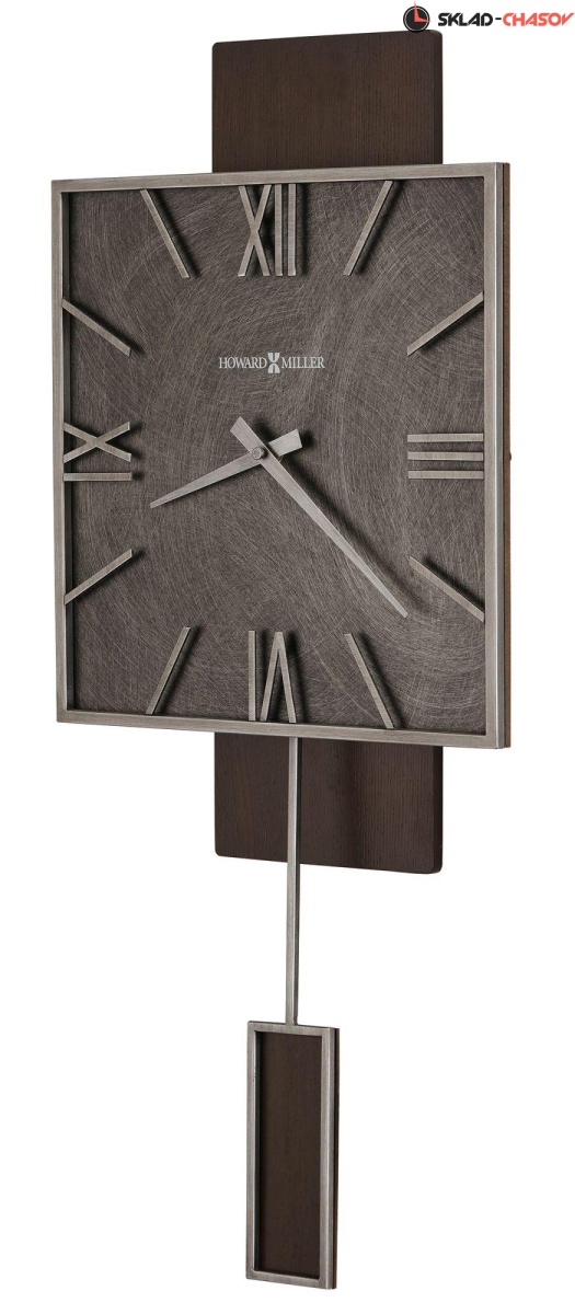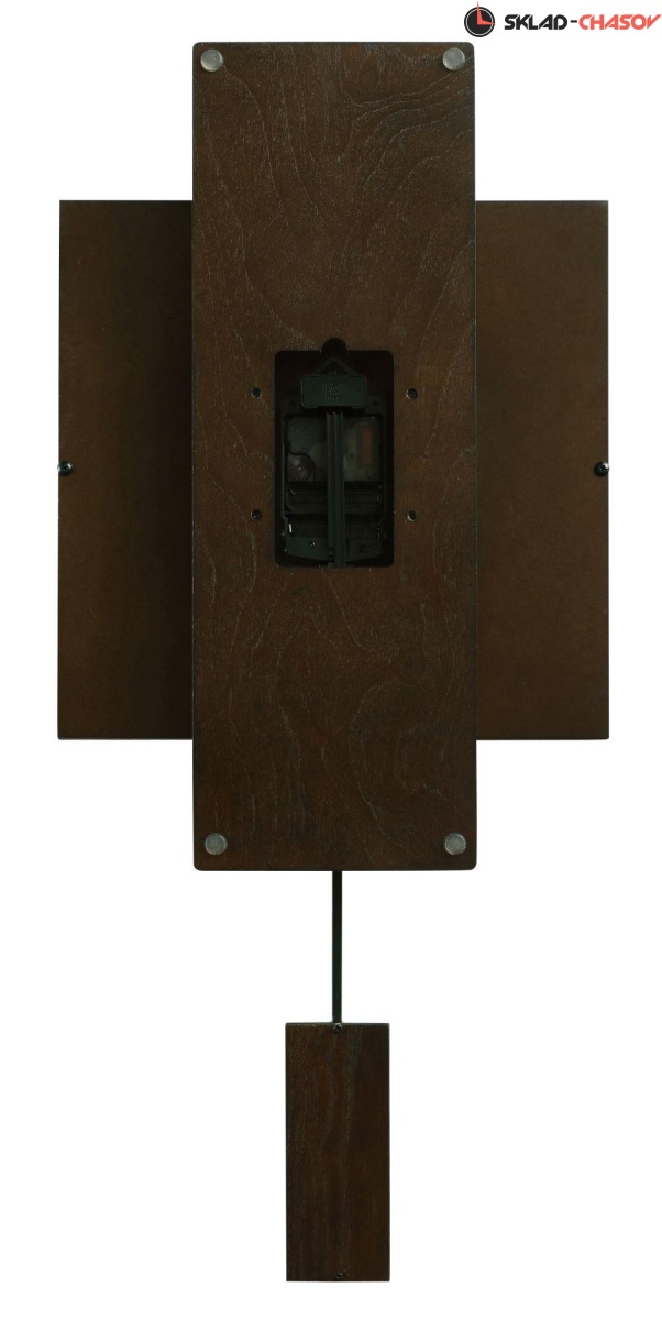 За квадратным циферблатом располагается длинная прямоугольная панель в матовом цвете эспрессо. Маятник прямоугольной формы выполнен в том же цвете и обрамлен металлической рамкой с отделкой под состаренное серебро. Это позволяет маятнику прекрасно дополить внешний вид часов.