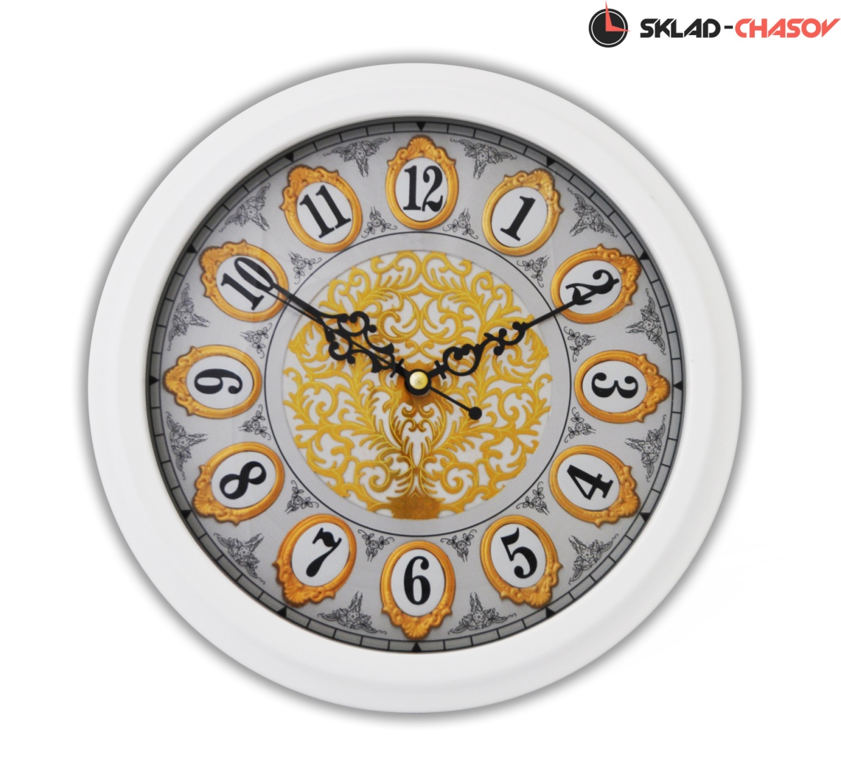 Настенные часы из МДФ с удачным сочетанием серебристого фона с золотом витиеватым внутренним орнаментом в белом обрамлении украсят стену Вашего дома. Часы снабжены механизмом плавного хода.