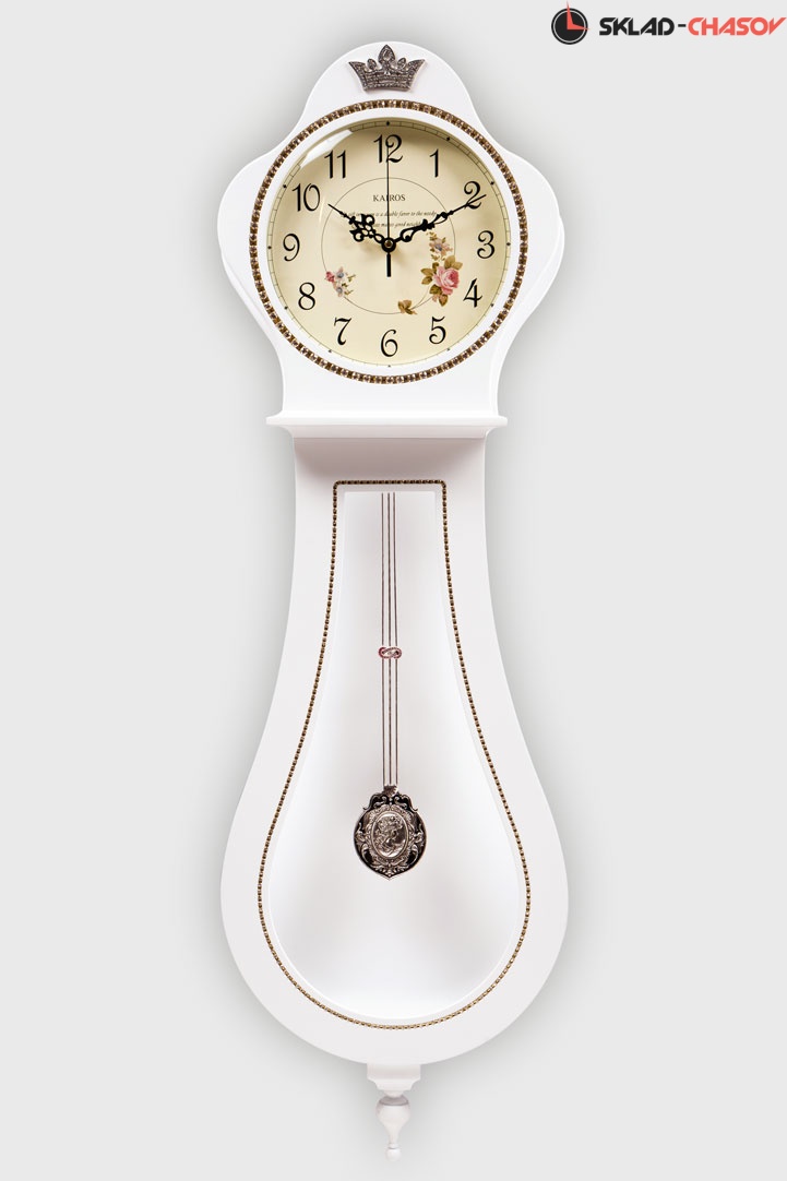 Белые настенные часы с маятником и бесшумным кварцевым механизмом, который работает от батареек типа АА (пальчиковые - входят в комплект). Корпус выполнен из прессованного дерева (МДФ). Маятник качается бесшумно, не влияет на ход часов. Циферблат классического белого цвета, закрыт стеклом. Временные рамки обозначены четкими, хорошо читаемыми арабскими цифрами.