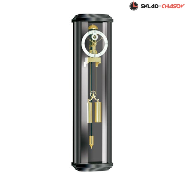 Механические настенные часы Kieninger 2723-96-01 заводные в корпусе из дерева, цвет - черный, с изогнутой передней дверью, открытый циферблат с двойной индикацией. В состав часов входят две подвесные гири и специальный маятник из карбона. С боем каждый час.