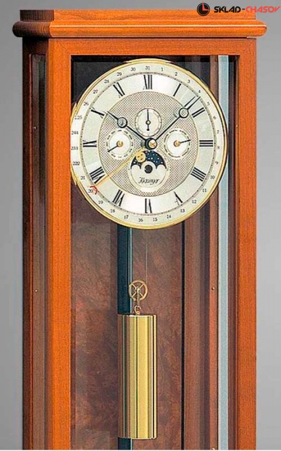 Часы со стеклом на передней и боковых поверхностях корпуса, с полированной латунной гирей и термокомпенсационным маятником.