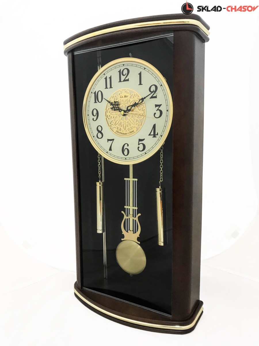 Настенные часы с маятником. 12 мелодий, кнопка прослушивания мелодий, регулятор громкости. Автоматическое ночное отключение звуков с 23.00 ночи до 6.00 утра. Маятник раскачивается бесшумно.