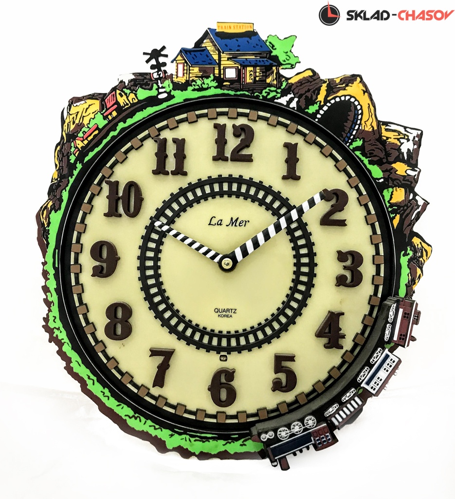 Часы настенные со звуком "Железная дорога". Поезд движется вокруг циферблата каждый час. Оснащены светодиодом, который автоматически переводит часы в ночной режим (в темноте звук отключается).