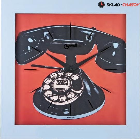 На квадратном циферблате полноцветное изображение ретро телефона.