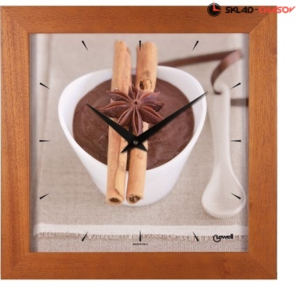 На квадратном циферблате полноцветное изображение шоколадного десерта с палочкой ванили.