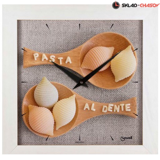 На циферблате квадратной формы полноцветное изображение двух половников с итальянской пастой.