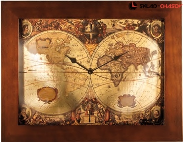 На квадратном циферблате полноцветное изображение полушарий планеты Земля.